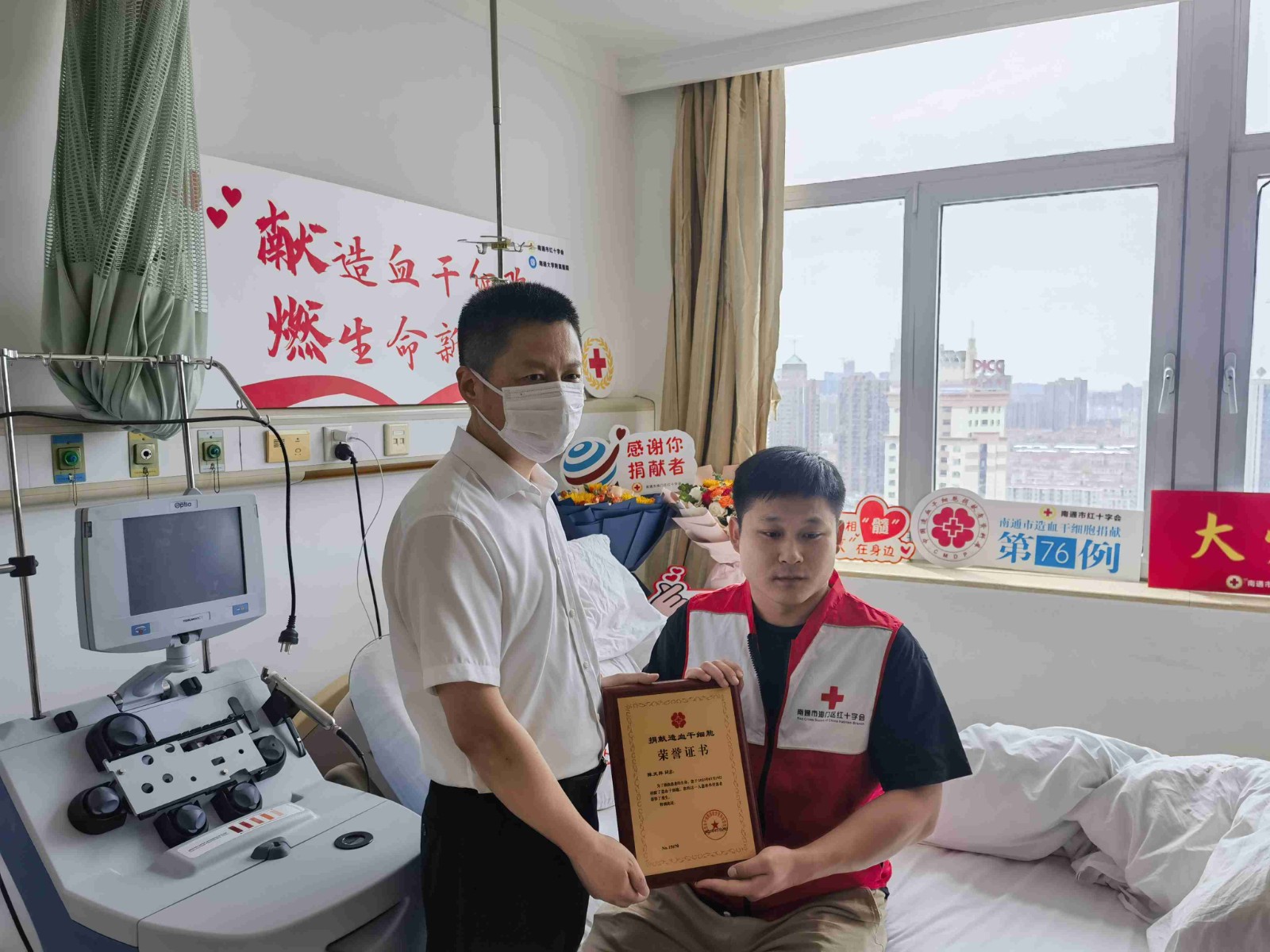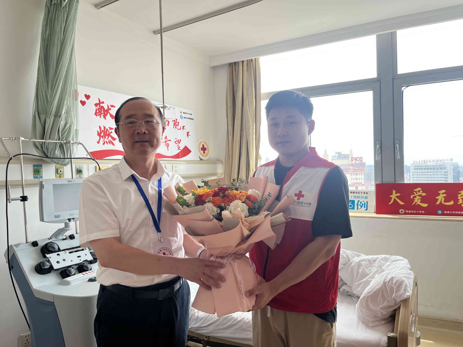 采集过程中,海门首例造血干细胞成功捐献者万顷波来到南通大学附属医院看望陈天羿,分享了自己的捐献经历和注意事项,并为他加油鼓劲。市区红十字会工作人员、陈天羿的父母也全程陪伴。