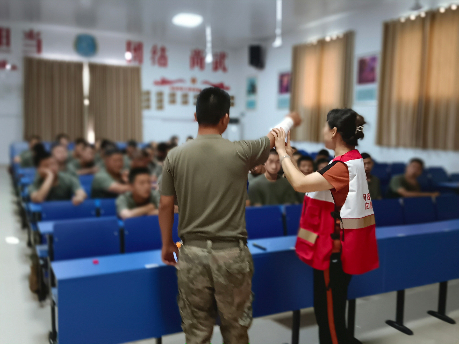 朱水清针对职业的特殊性,给战士们生动地讲解了有关外伤救护止血、包扎、骨折固定、搬运、窒息急救、心肺复苏、触电、高空坠落、烧伤等比较容易发生的险情应急急救知识。