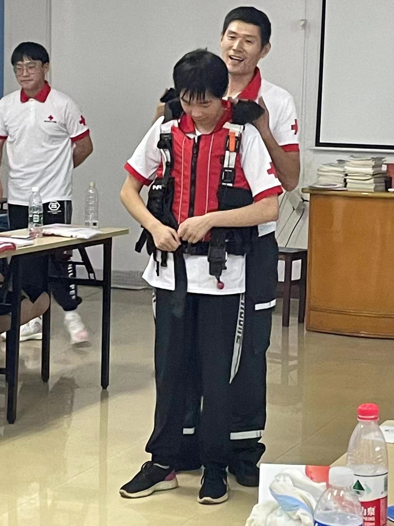 活动现场,红十字会志愿者通过视频播放、知识解答、操作示范、现场互动等方式,向同学们讲解了防溺水知识和自救互救技巧。红十字志愿者还示范了救生衣正确穿法和有效自救姿势,并利用救生杆、救生圈等进行防溺水救护示范教学,让学生在实操演练中掌握防溺水自救与互救技能。