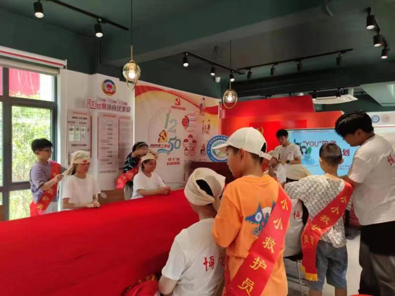 在陪伴课堂上,学生志愿者们用清楚有趣的语言向小朋友们介绍了“黄金四分钟”的重要性,并生动演示了心肺复苏、海姆立克以及紧急包扎等急救方法。最让小朋友们开心的是学习环节后,志愿者们还向现场的小朋友们发出了“紧急包扎”实践邀请,小朋友们积极参与,一拿到纱布,就迫不及待地为志愿者们包扎了起来,有的小朋友完美地为志愿者包扎好了伤口;有的小朋友把志愿者的手包成了“大包子”,幸亏被及时“解救”下来。小朋友们一一体验,学得有模有样,现场一片暖意涌动、笑声连连。学生志愿者吴海涛说,“我是一名刚退伍的大学生,能将入伍期间学到的急救知识和操作技能教给小朋友们,很有意义,希望能帮助更多的孩子成为一名具有自救能力,又能救助他人的爱心‘救护员’。”