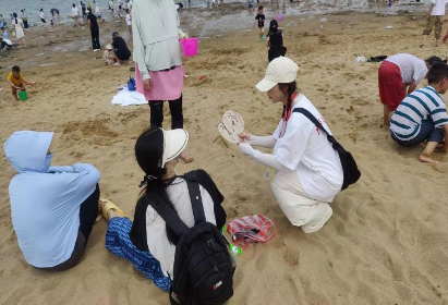 活动伊始,队长尹朝阳在全体红十字会志愿者集合后对此次活动流程和注意事项进行简要叙述。到达预先地点后,红十字会志愿者将自己手里的宣传单和扇子分发给来往游客并向其介绍有关于预防溺水的安全知识。 红十字志愿者将扇子宣传完毕后看到有很多小孩在没有父母陪同下私自进行游泳,便纷纷跑到小朋友面前让其预防溺水风险。