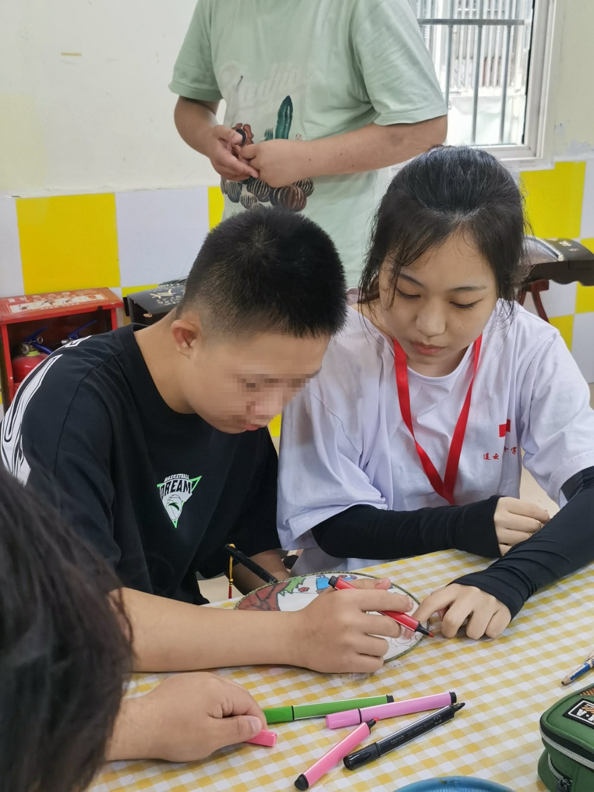 热身结束后我们正式开启了下午的任务——画扇子。年龄较小的唐宝宝们不能熟练用笔绘画,于是他们的双手便成了笔,红十字志愿者们便成了执笔的人。稍大一些的唐宝宝们在红十字志愿者们的悉心指导和耐心帮助下,也顺利完成了自己的作品。