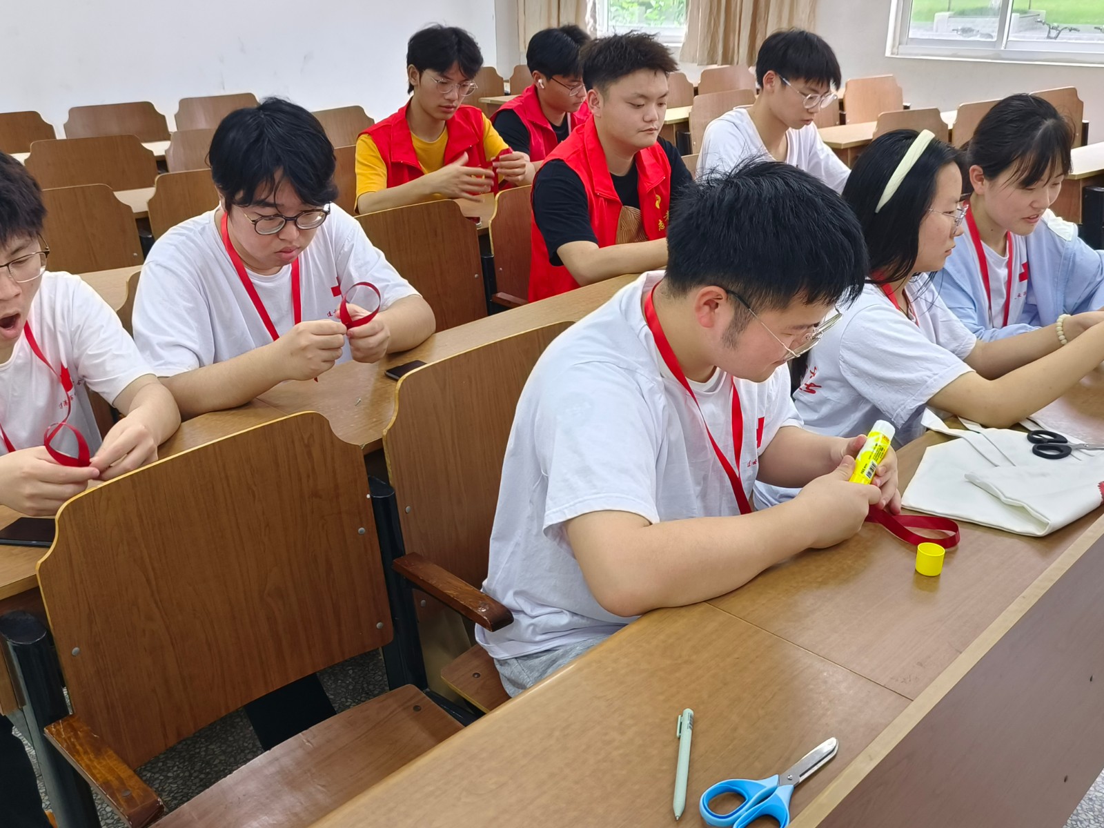 6月28日下午,志愿者们在文通楼118室制作红丝带,将红丝带装饰在有关防艾的文创帆布包上。同时,志愿者们还利用红丝带拼出“防艾”字样,表达自己的美好祝愿。活动结束时,志愿者们与作品合影留念。