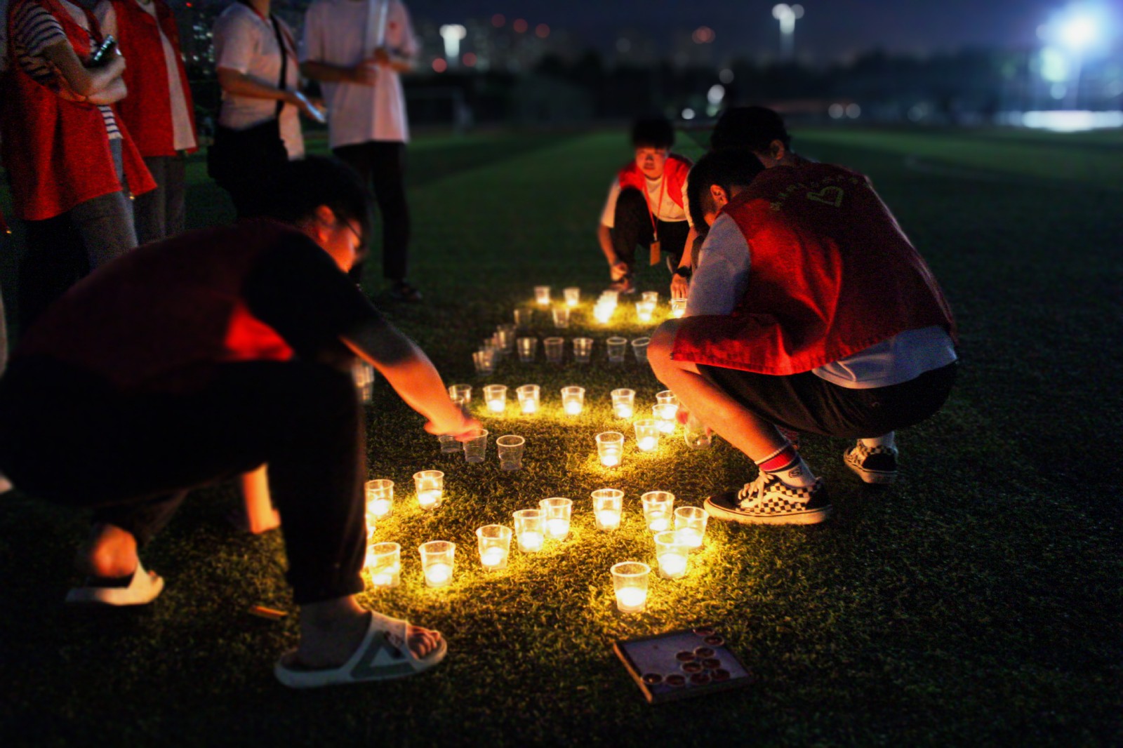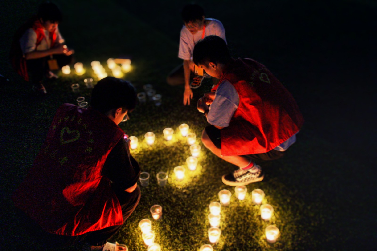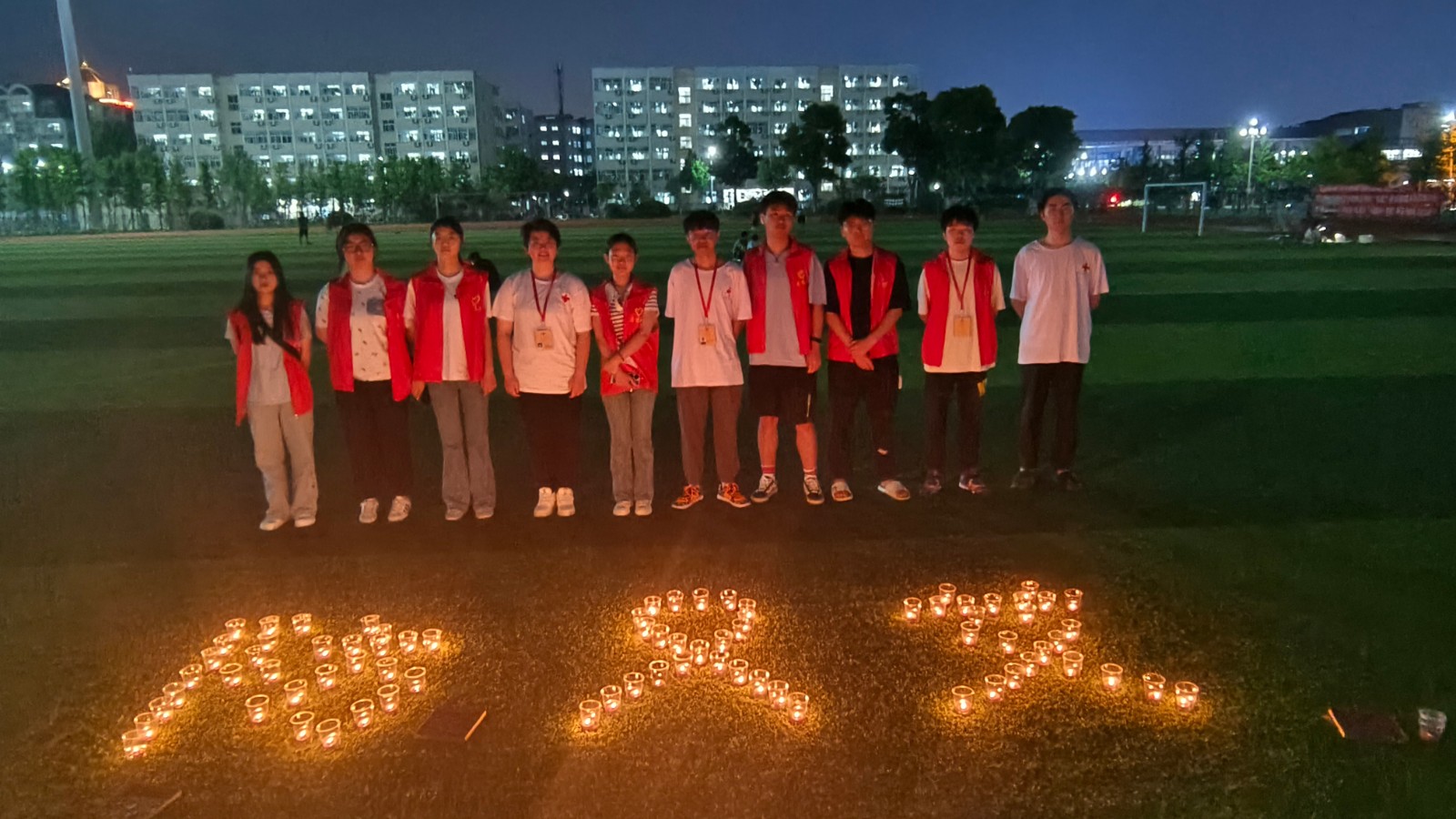 晚上,红十字志愿者在苍梧校区西操场举办蜡烛标语活动。志愿者们亲自点燃蜡烛并将它们摆放成“AIDS”加防艾红丝带的形状。这些烛光,象征着生命和希望,烛光摇曳,在漆黑的夜晚绽放出光亮,艾滋病患者的生活也应同这烛火般发光发热,绚烂夺目。接着每位志愿者在蜡烛前表达自己对艾滋病患者的祝愿,将爱心传递。本次活动吸引了许多同学的关注,起到良好的示范引领作用,将防艾知识进行了广泛宣传。最后,志愿者们在蜡烛前合影留念。