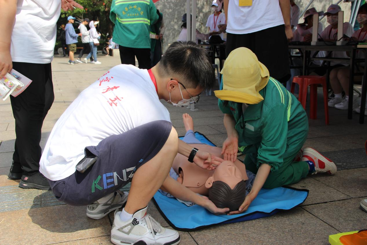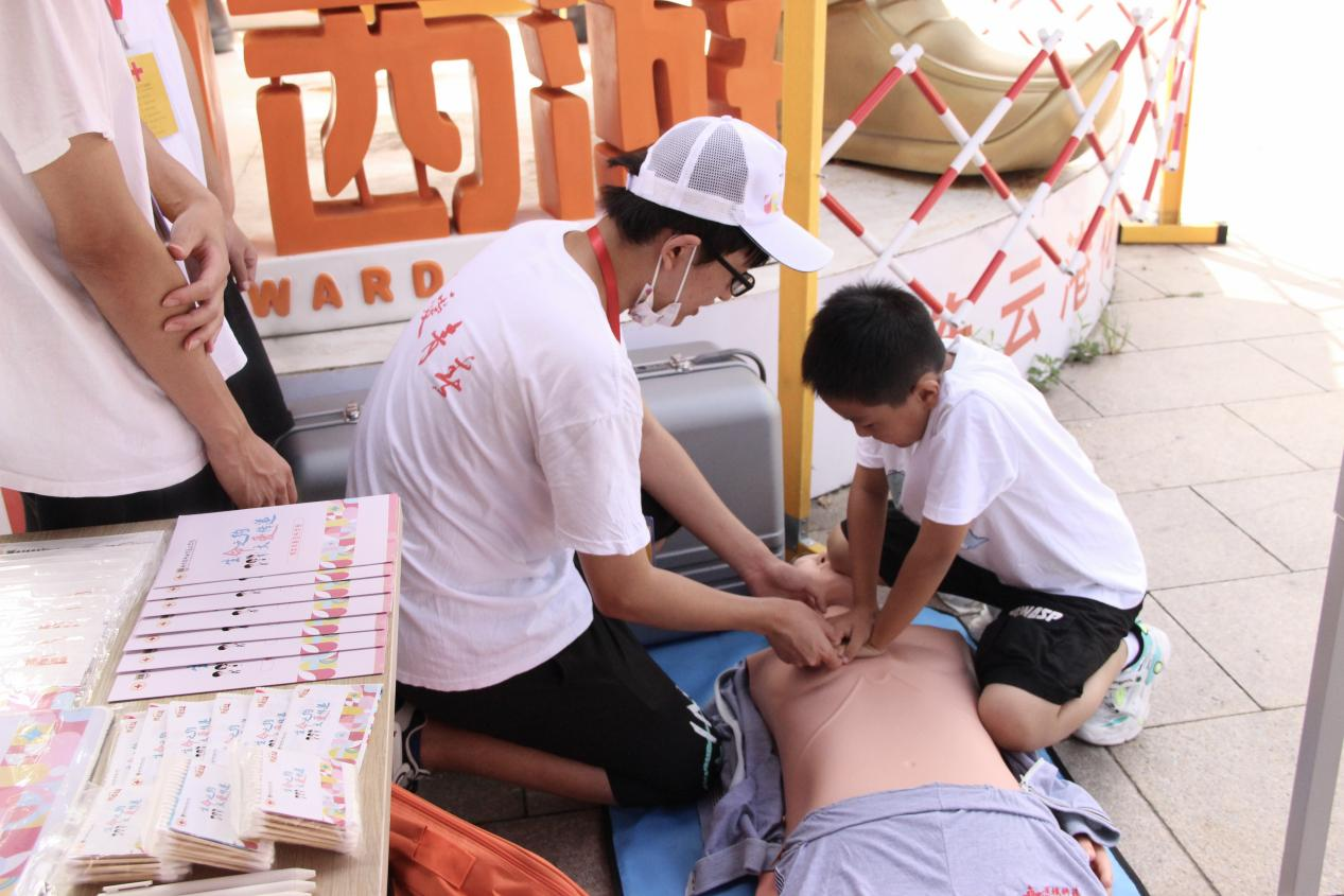 CPR教学组的志愿者,细心耐心地教愿意学习的游客心肺复苏的流程和方法要点。景区的很多工作人员都认真学习急救知识,并在假人上练习。