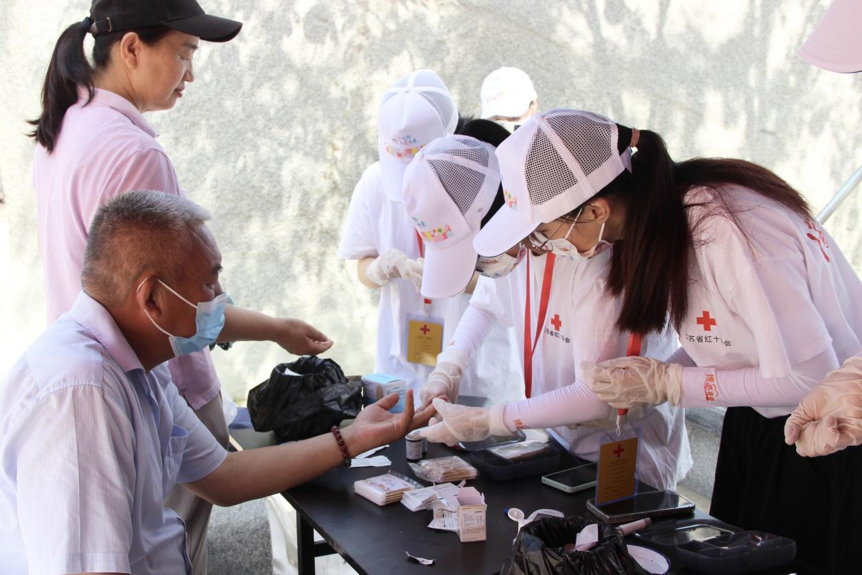 宣传引导组的志愿者们顶着炎炎烈日,热情地邀请游客们参与爱心义诊,发放宣传手册,宣传“三献”知识和新冠病毒抗原检测试剂盒的使用方法。