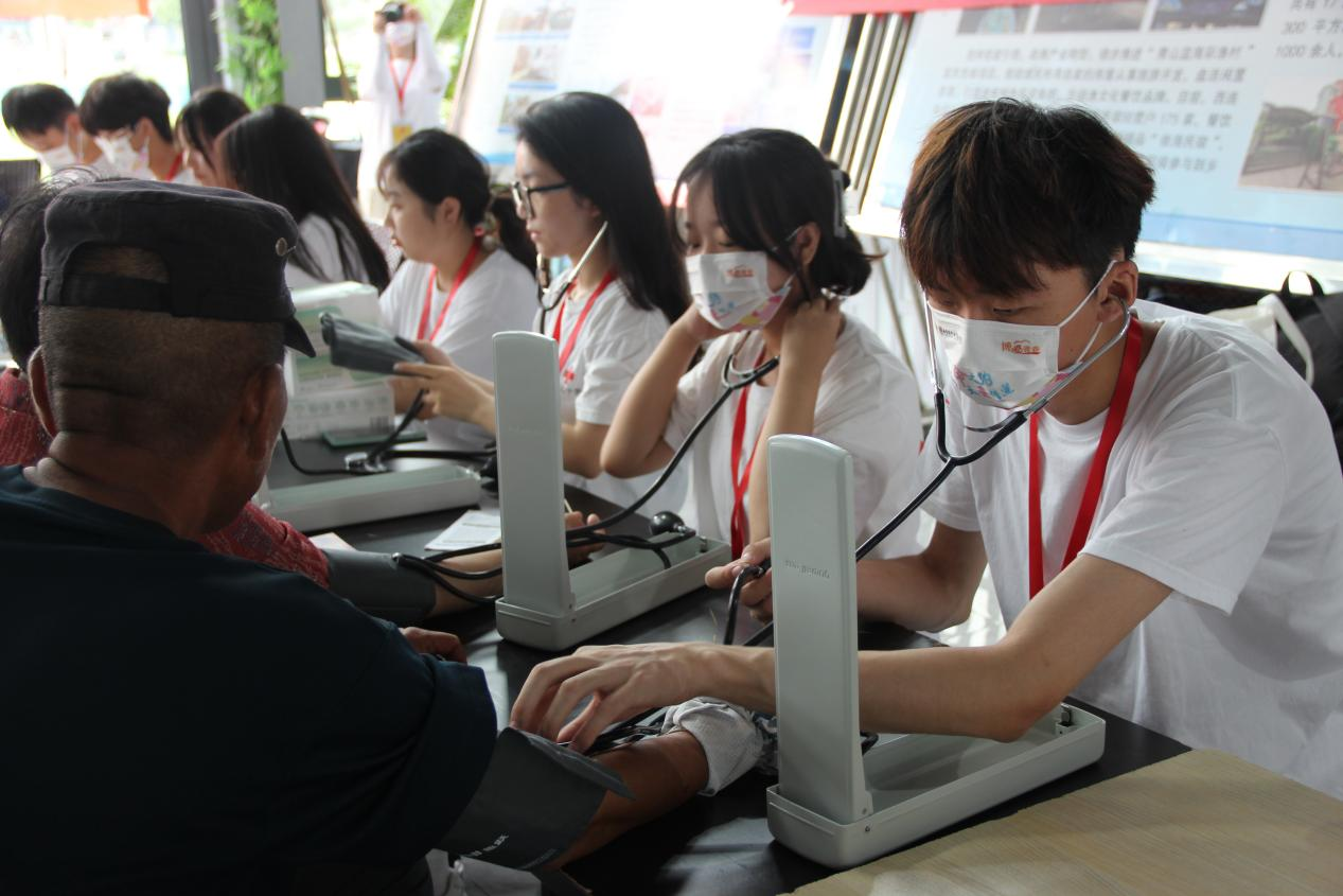 活动过程中,义诊的椅子座无虚席,许许多多的老人来测量血糖、血压、血氧。哪怕天气炎热、阳光毒辣,血压组的志愿者们隔着冰袖、防晒衣给居民测血压依旧轻松顺利。