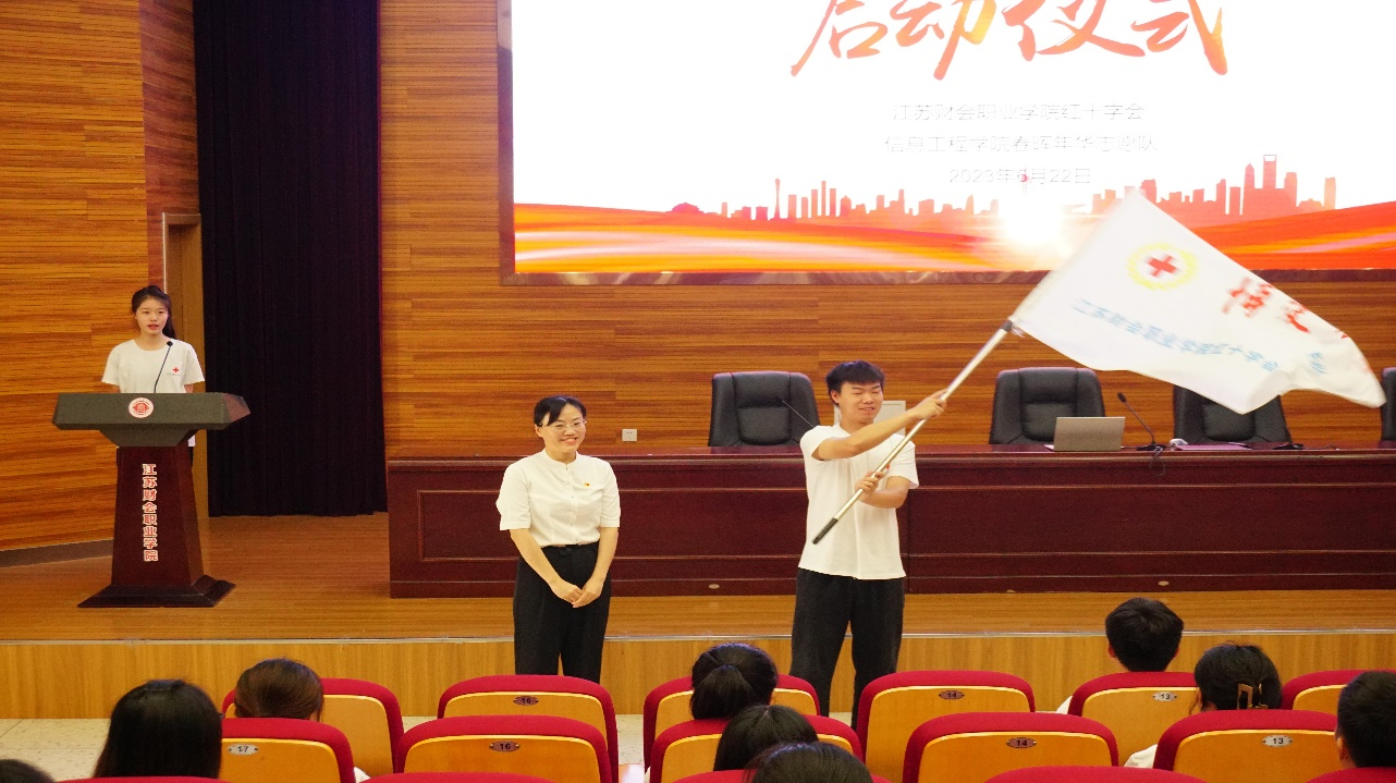 礼毕,项目指导老师王晶为志愿者代表授旗,挥扬的 “博爱青春”旗帜标志着2023江苏财会职业学院“博爱青春”暑期志愿服务项目正式启动。