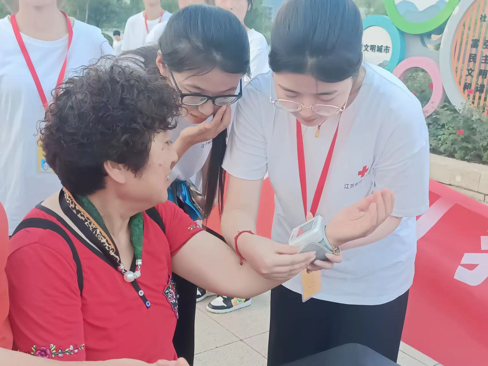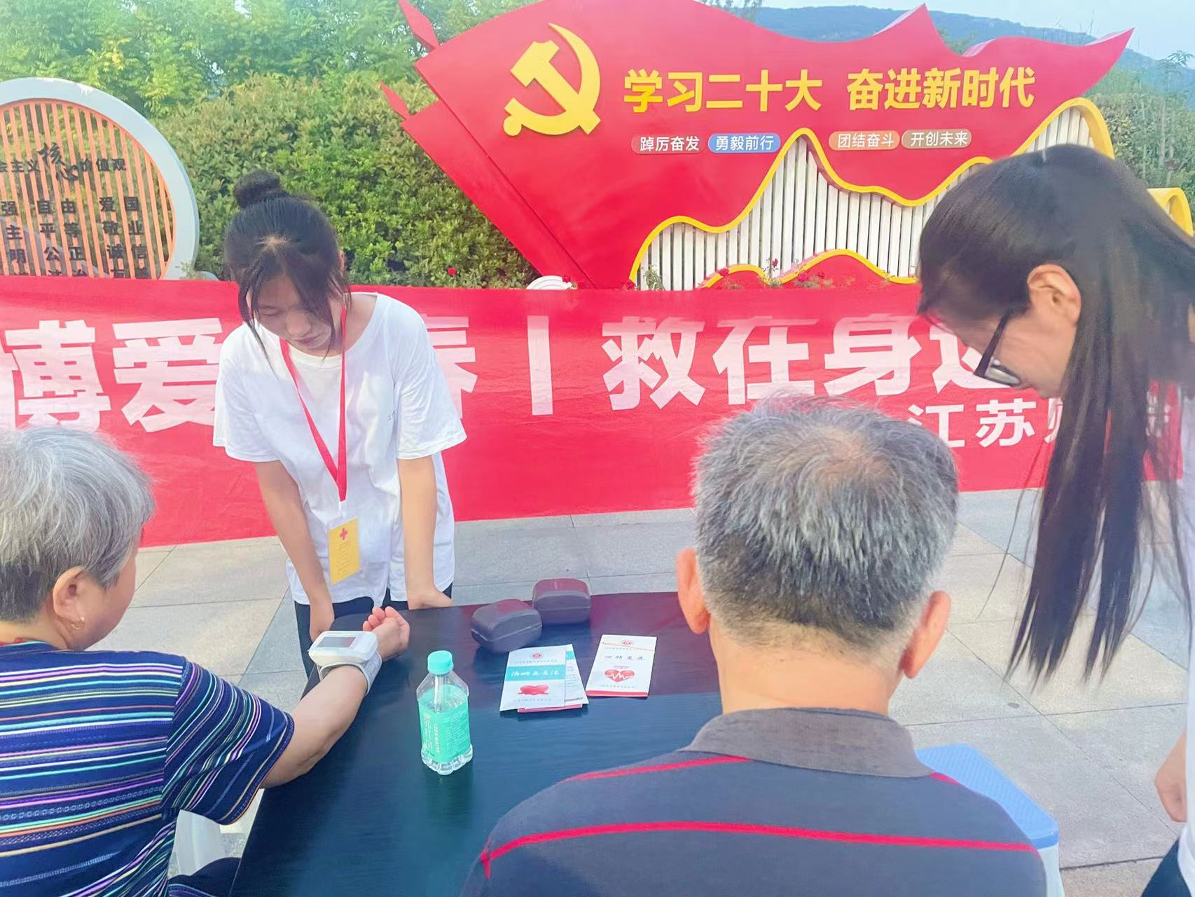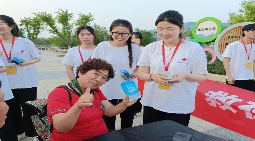 同时,另一边“关爱生命健康”志愿服务组的志愿者们认真有序地为现场的民众测量血压、血糖、血氧。志愿者们依托人工智能和大数据的专业背景与红十字救护知识相结合,认真为前来咨询的居民解答疑问,同时提醒居民在日常工作生活中,要保持良好健康生活习惯,做到防治结合。