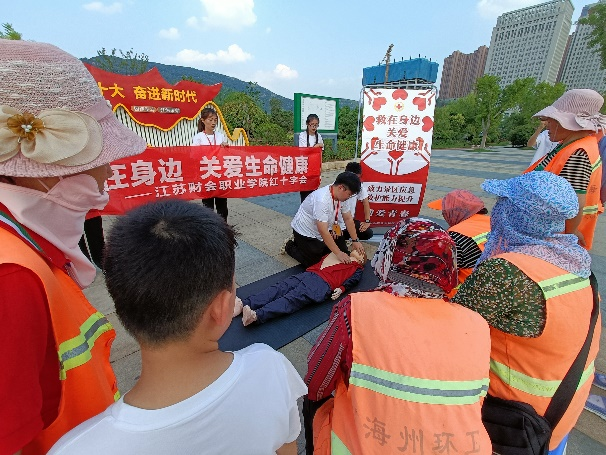 盛夏七月,骄阳似火,炎炎烈日阻挡不了江苏财会职业学院红十字会春晖年华先锋队志愿者们投身“博爱青春”暑期志愿服务的蓬勃热情。为进一步提升连云港市花果山景区一线工作人员安全意识和应急救护能力,助力打造健康文明旅游城市名片,春晖年华先锋队志愿者来到景区,为景区的环卫工人开展急救知识和实操技能专题培训。