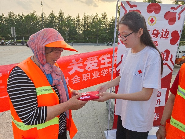 在这炎炎夏日,江苏财会职业学院红十字会春晖年华先锋队志愿者们的爱心志愿服务如同一股清流,滋润了环卫工人的心,为他们送上关心关爱的同时,也宣传了应急救护知识,充分展现了“人道、博爱、奉献”红十字精神。