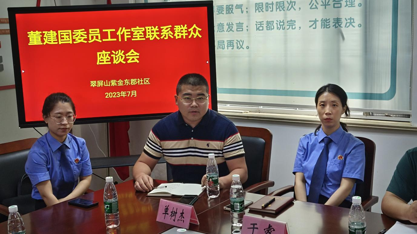 为进一步探索人道事业发展,畅通服务群众“最后一公里”,近期,翠屏山街道办事处在紫金东郡社区董建国委员工作室组织召开委员工作室联系群众座谈会。会议由区政协社会福利和社会保障界别召集人、区红十字会党支部书记、常务副会长董建国主持,界别委员小组成员王丽、于睿、李政、单树杰,区红十字会党支部、区检察院有关同志,翠屏山街道党工委副书记王守运及社区居民代表参加会议。