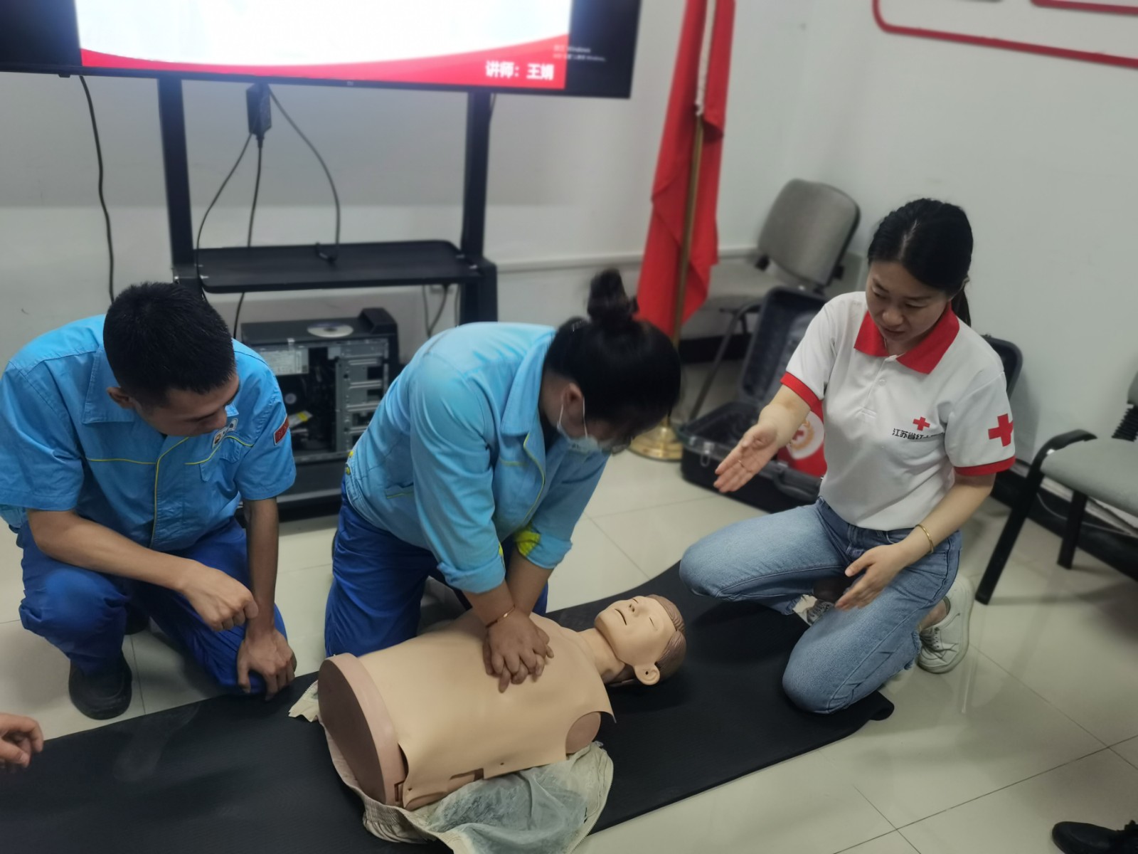 培训现场,授课师资围绕心肺复苏(CPR)操作流程、自动体外除颤器(AED)的使用方法、应急救护包扎等内容,以人体模型、PPT展示相结合的形式,生动形象地介绍了心搏骤停的原理及快速判断倒地患者是否需要实施急救的方法,详细演示了成人实施徒手心肺复苏(胸外按压)和使用AED的流程、方法及注意事项,现场对员工实操手法进行指导。在救护师资的指导下,学员们很快就把课堂知识转化成了实际操作技能。参与员工们纷纷表示收获颇丰。