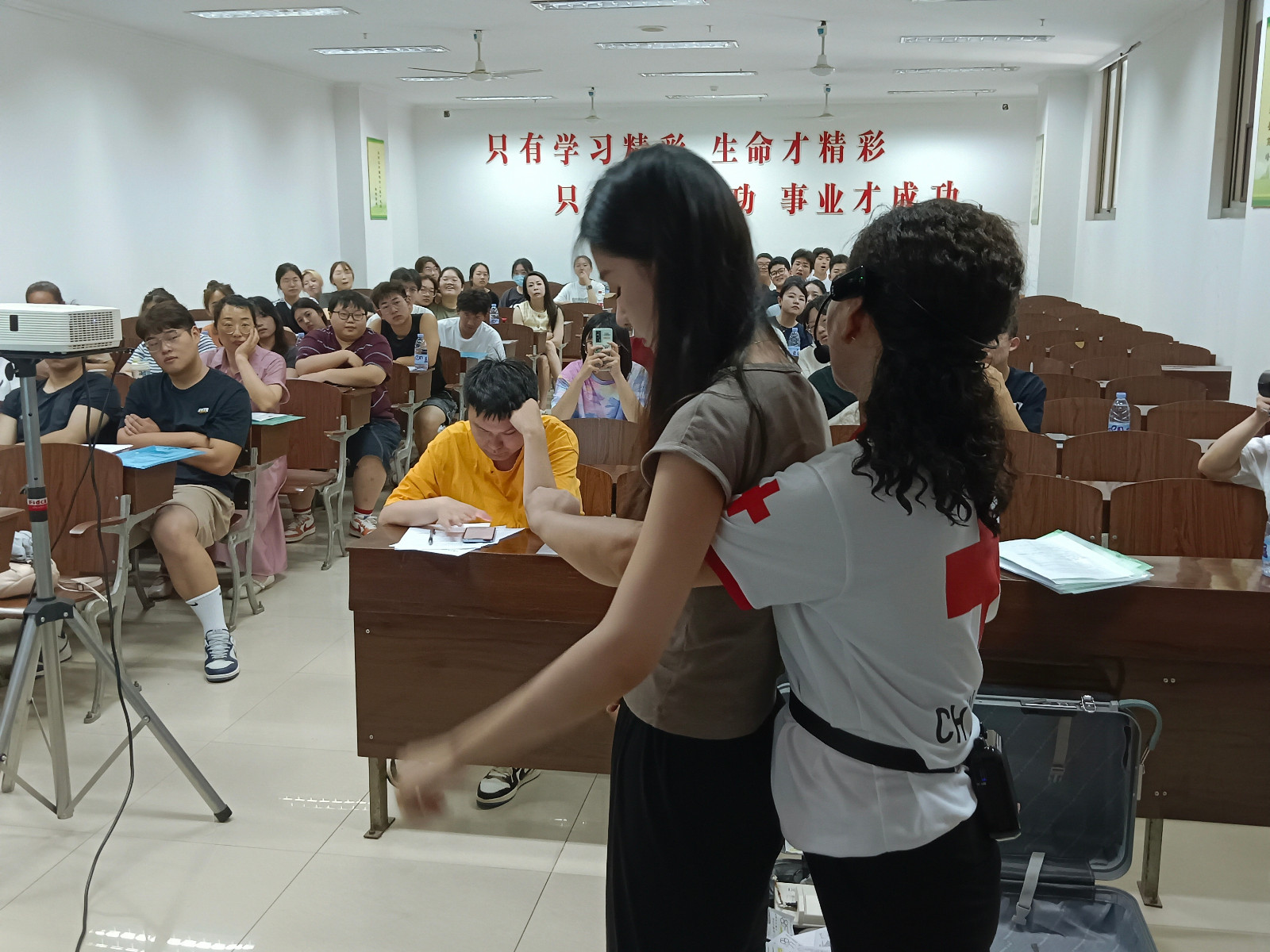 赵小文为大家讲解了创伤救护的相关知识,并现场演示创伤包扎等相关技能。学员们分成两三人一组,利用教学道具模拟学习包扎技术。