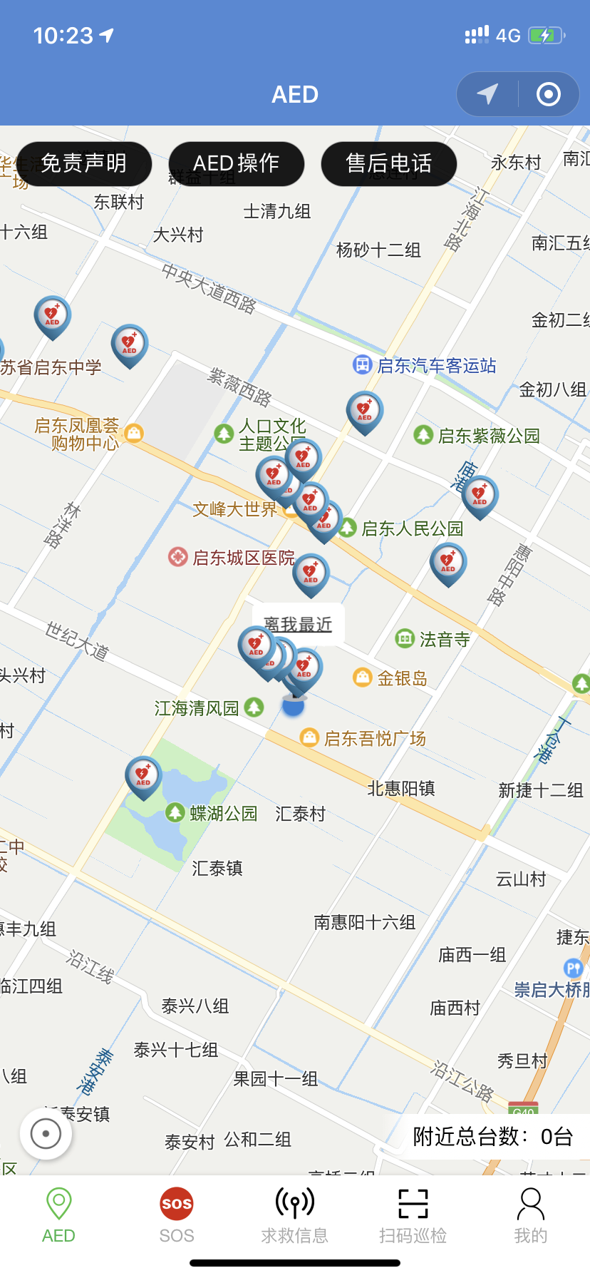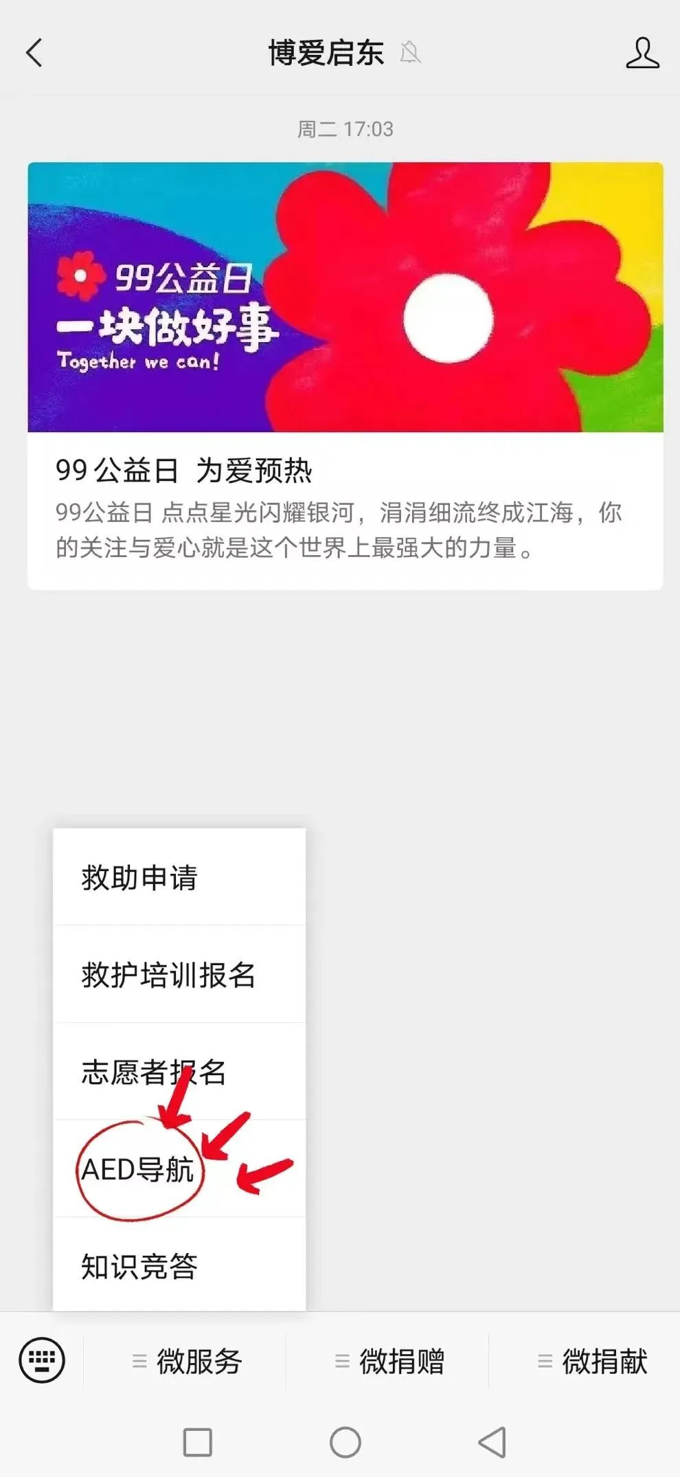 关注博爱启东,点开微服务-AED导航,即可搜索你附近的AED设备。