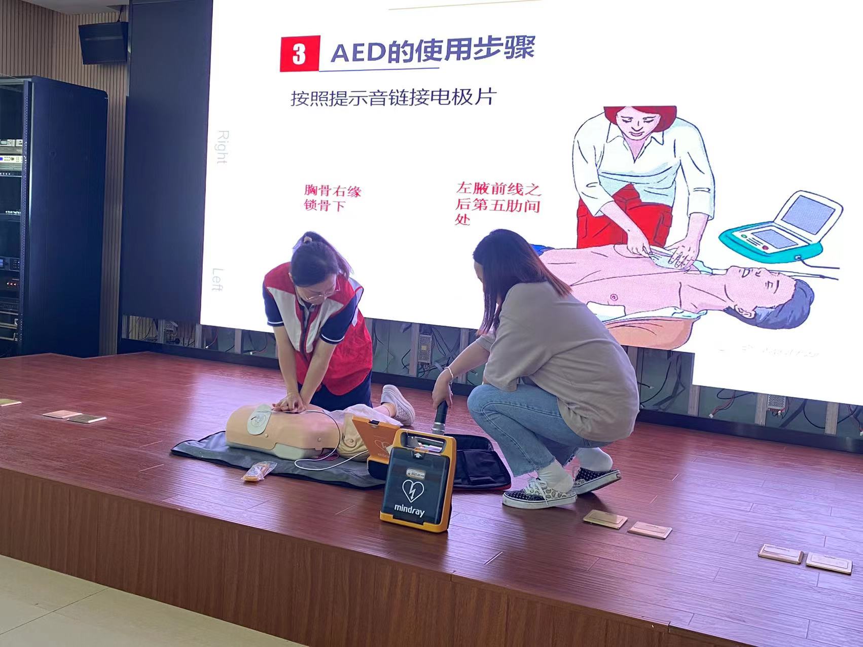 区红十字会培训师采用理论和操作结合的教学形式,为大家讲授了心肺复苏、AED自动体外除颤器使用、气道异物梗阻急救等急救知识和技能。学员们一边观看演示,一边现场学习按压的手法和姿势,找准按压位置,掌握按压力度和按压频率。
