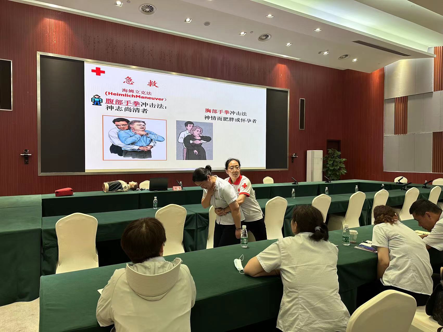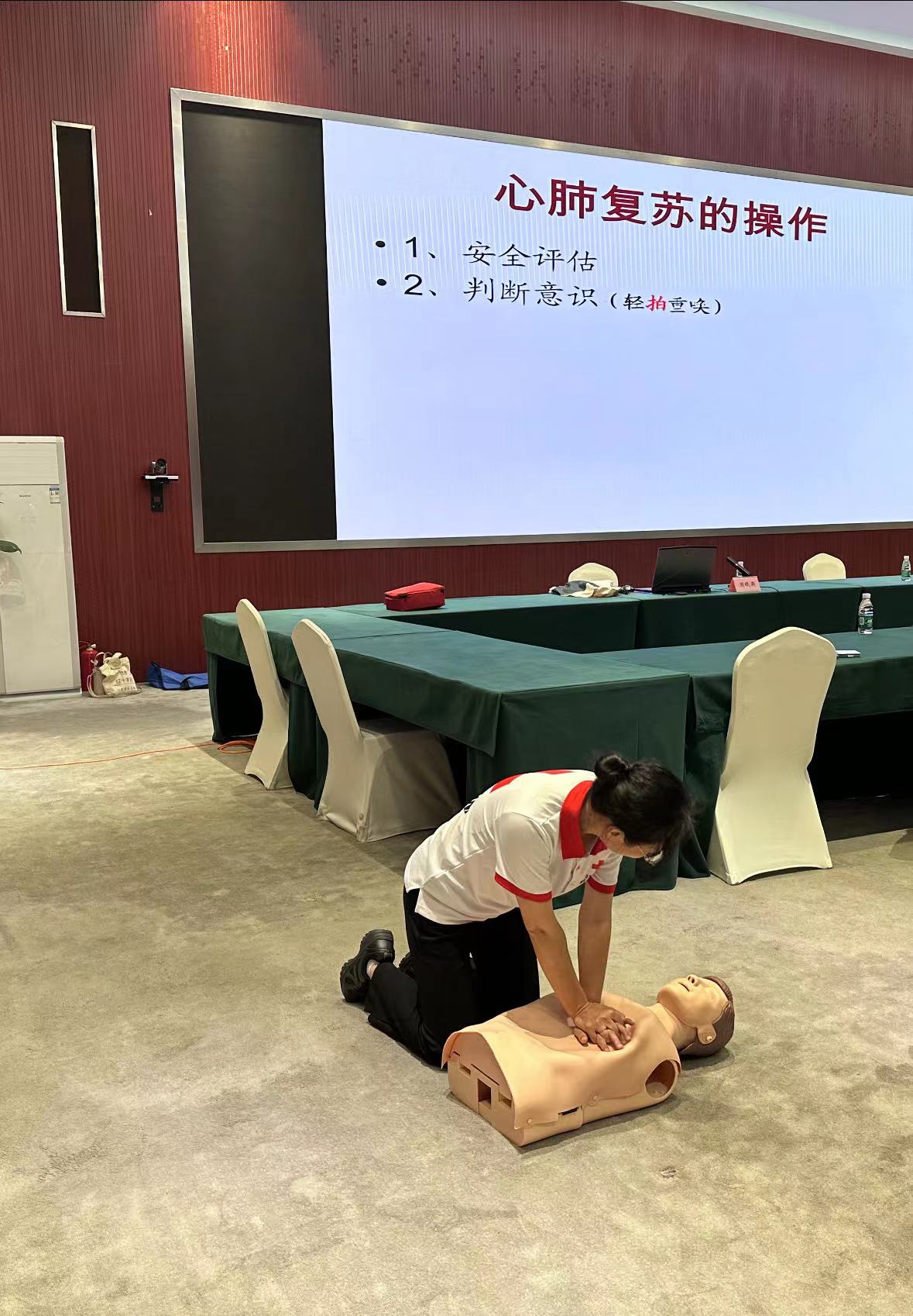 培训中,赈济救援队队员、救护师资周晓燕对心肺复苏、自动体外除颤仪(AED)使用、气道异物梗阻、溺水、包扎等常见急救知识进行逐一讲解。结合模拟人对心肺复苏进行了现场示范,并邀请员工上台进行模拟训练。