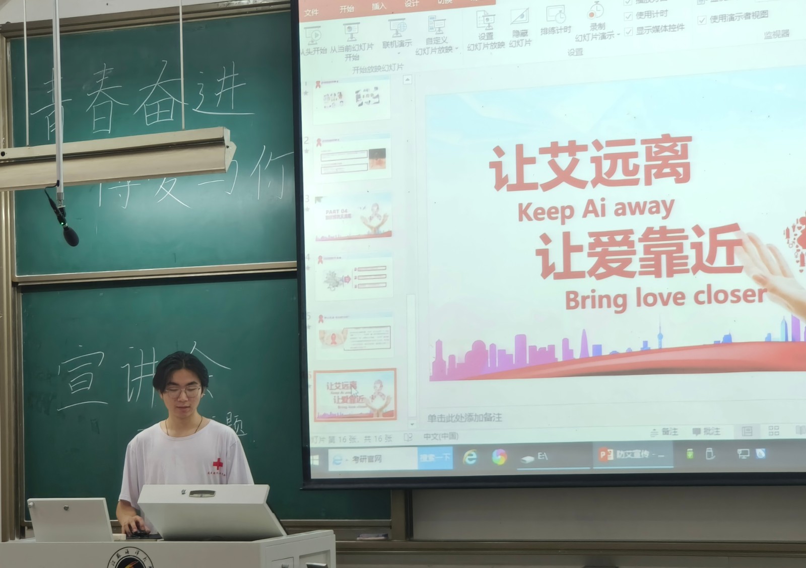 上午,实践团队成员在文通楼开展防艾知识宣讲会,通过PPT、在线视频等多种形式向参会人员普及日常生活中防控艾滋病传播的相关知识,并在结束后向与会人员分发了防艾主题文创作品。
