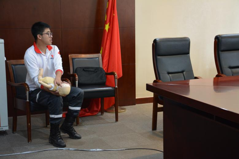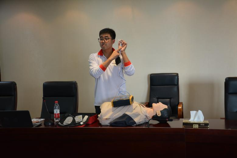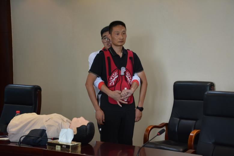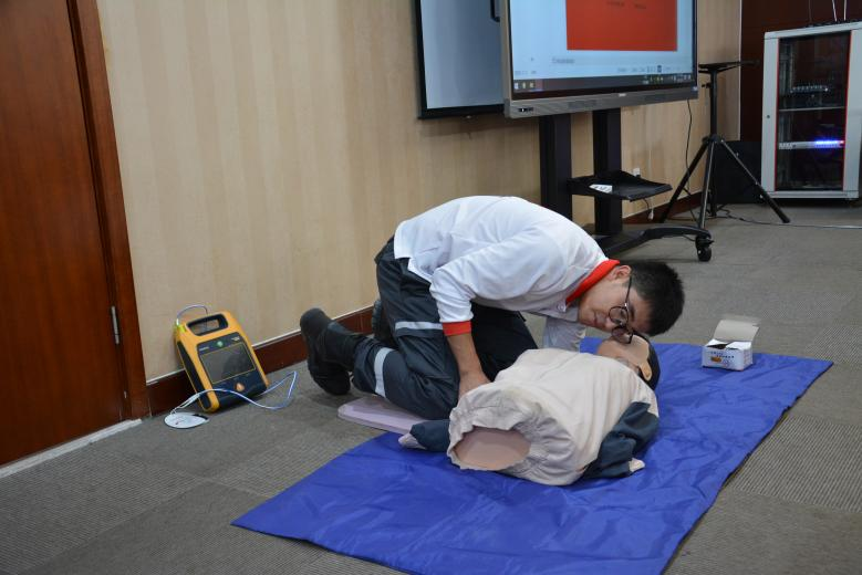 培训过程中,救护师为参培人员详细讲解了如遇婴幼儿遭遇急性呼吸道异物堵塞时应采取的急救措施及注意要点。并且利用模拟假人演示了心肺复苏和自动体外除颤器(AED)使用的操作步骤和要领。同时,为了更直观的演示也为了让参培人员更好地掌握海姆立克急救方法,救护师和参培人员相互配合完成了一次“真人实战”演练。