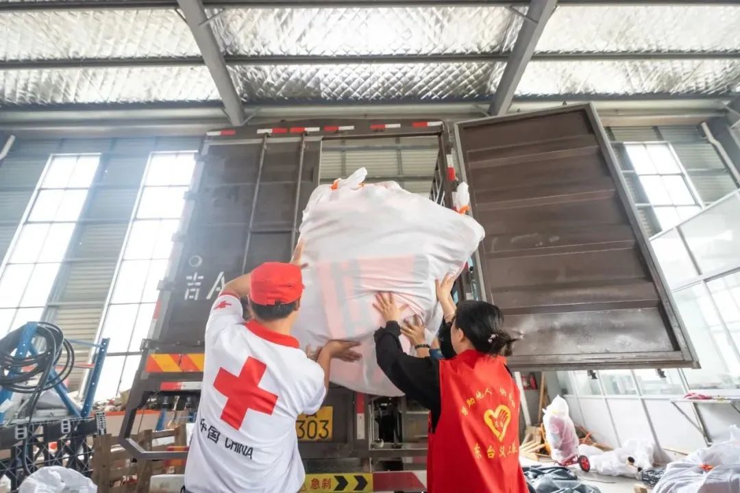8月7日上午9时许,兴盾船舶设备有限公司的仓库里,市红十字会、市义工联志愿者及厂里工人齐心协力往卡车上搬运救援救生物资,确保尽快发车,通过中国红十字基金会定向发往五常灾区。
