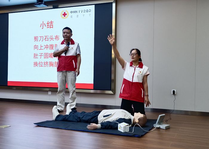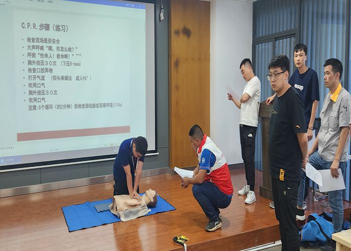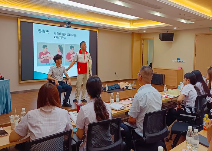 在苏银村镇银行培训中,陆老师给50余名银行员工讲授了心肺复苏、气道异物梗阻的现实案例和实际操作,并采用模拟人教具,让每个学员都能参与练习操作,耐心指导纠正急救手法,规范操作流程,掌握AED机的正确使用,强调了应急救护“黄金四分钟”的重要性。