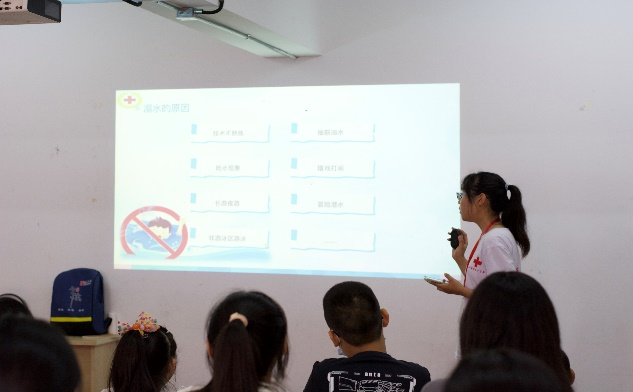 到达书画社后,活动负责老师带领团队前往宣讲教室,随后宣讲活动正式开始,由团队成员江楠向青少年介绍防溺水以及安全用药两大基础知识。