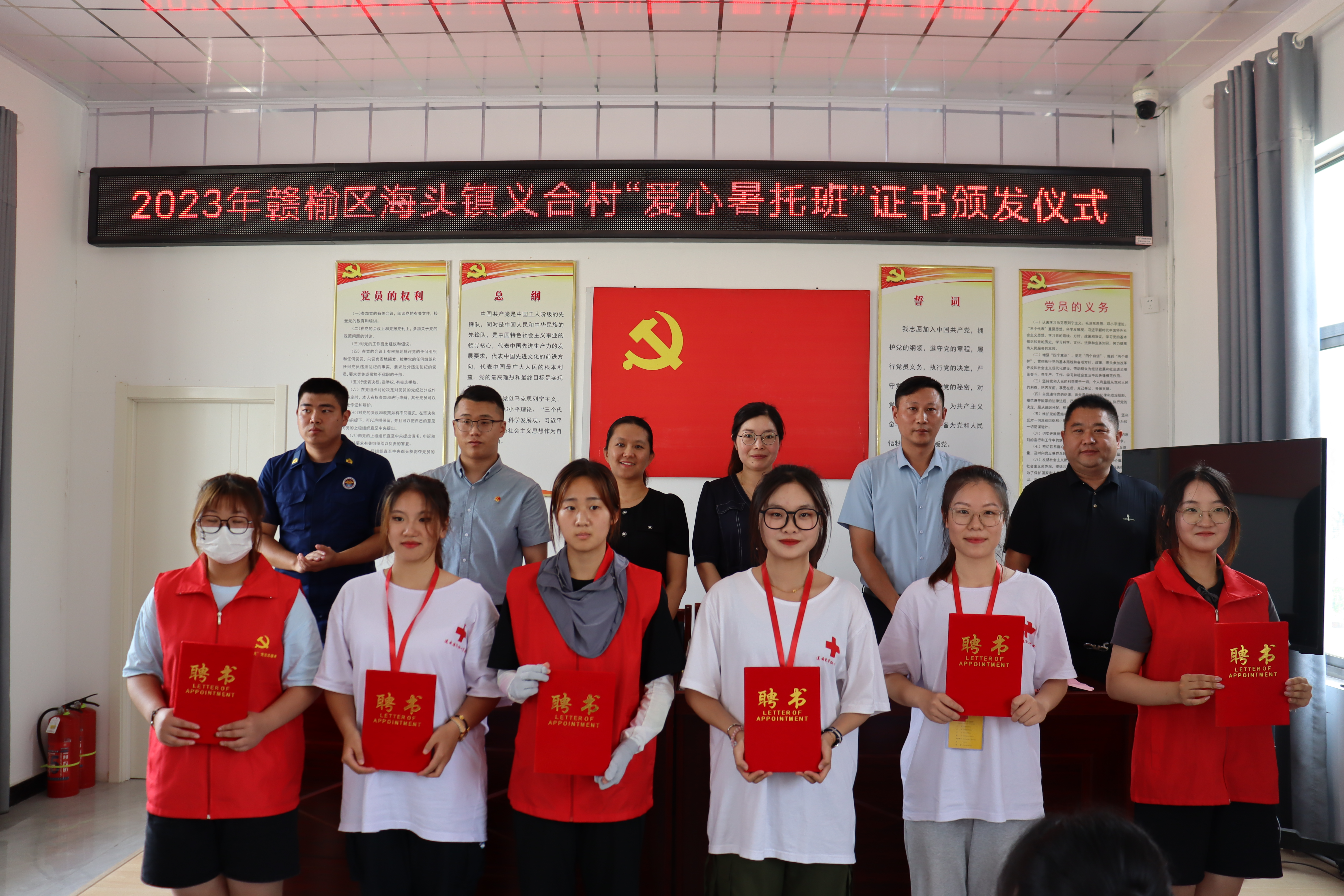 7月10日,学校红十字会与海头镇义合村青少年之家举行赣榆区2023年省级爱心暑托班的启动仪式。校团委书记兼机关党总支书记(党委组织部、统战部副部长)赵昕、海头镇宣传办主任吴苏红、赣榆团区委办公室主任李翔、城发集团海头分公司党支部书记田锡建、义合村党总支书记闫朝斌、连云港市赣榆区消防救援大队班长宋杰出席仪式。