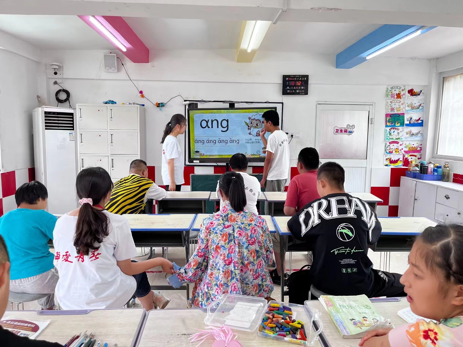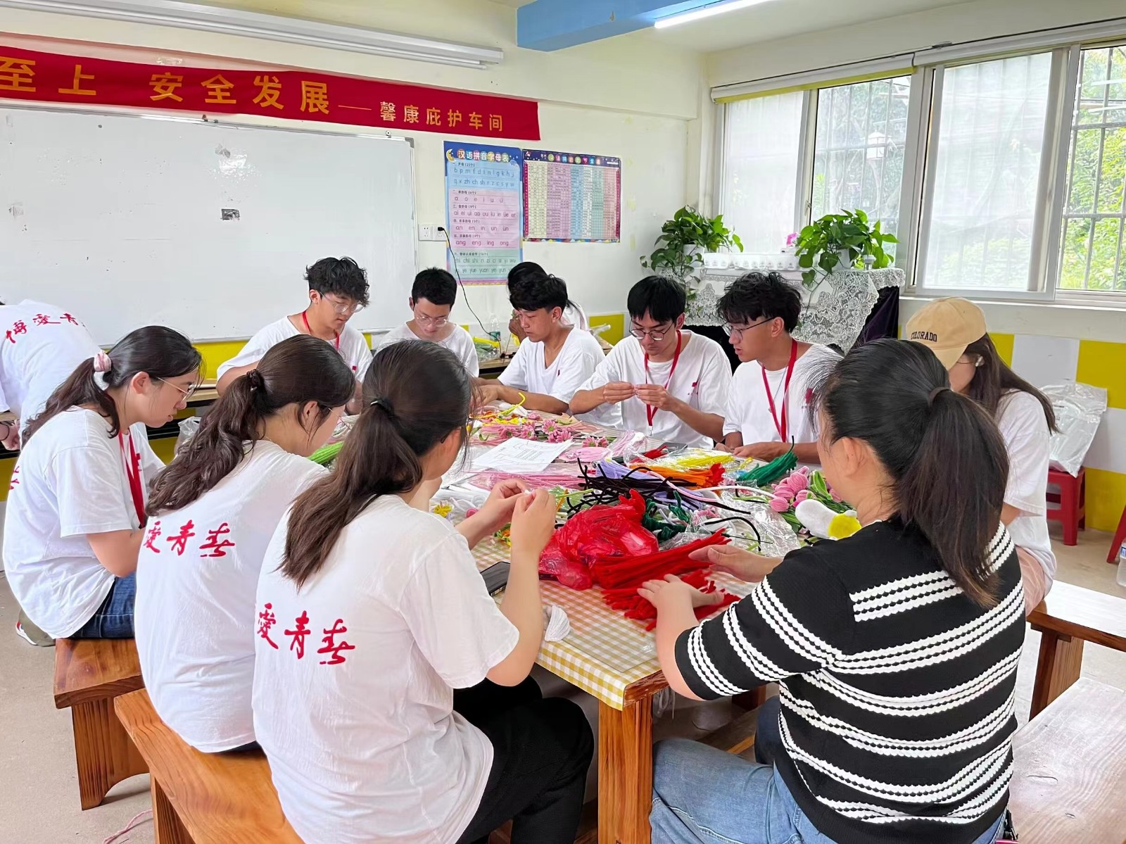 志愿者分为三组开展活动,一组是完成扭扭棒、钩针编织等手工艺品的制作,一组是陪伴唐宝宝们早操早读与制作感谢卡片,还有一组则是带着年龄较小的唐宝们在楼上的教室进行识字、学唱歌和玩游戏。一日之计在于晨,伴随着音乐的响起,唐宝宝们在志愿者的带领下,兴致勃勃地跳起早操,尽管他们需要志愿者的辅助才能完整地做完,但这并不影响他们尽情地舞动身姿。早操过后就是课堂时间,超越组和梦想组的唐宝们在志愿者的带领和引导下,沉醉在知识的海洋之中,朗朗的读书声不绝于耳。快乐组的唐宝们则在志愿者们的引导下学起了儿歌《我爱妈妈》。起初,唐宝们都有些拘谨,但在志愿者们的鼓励下,他们逐渐和志愿者们有了互动。
