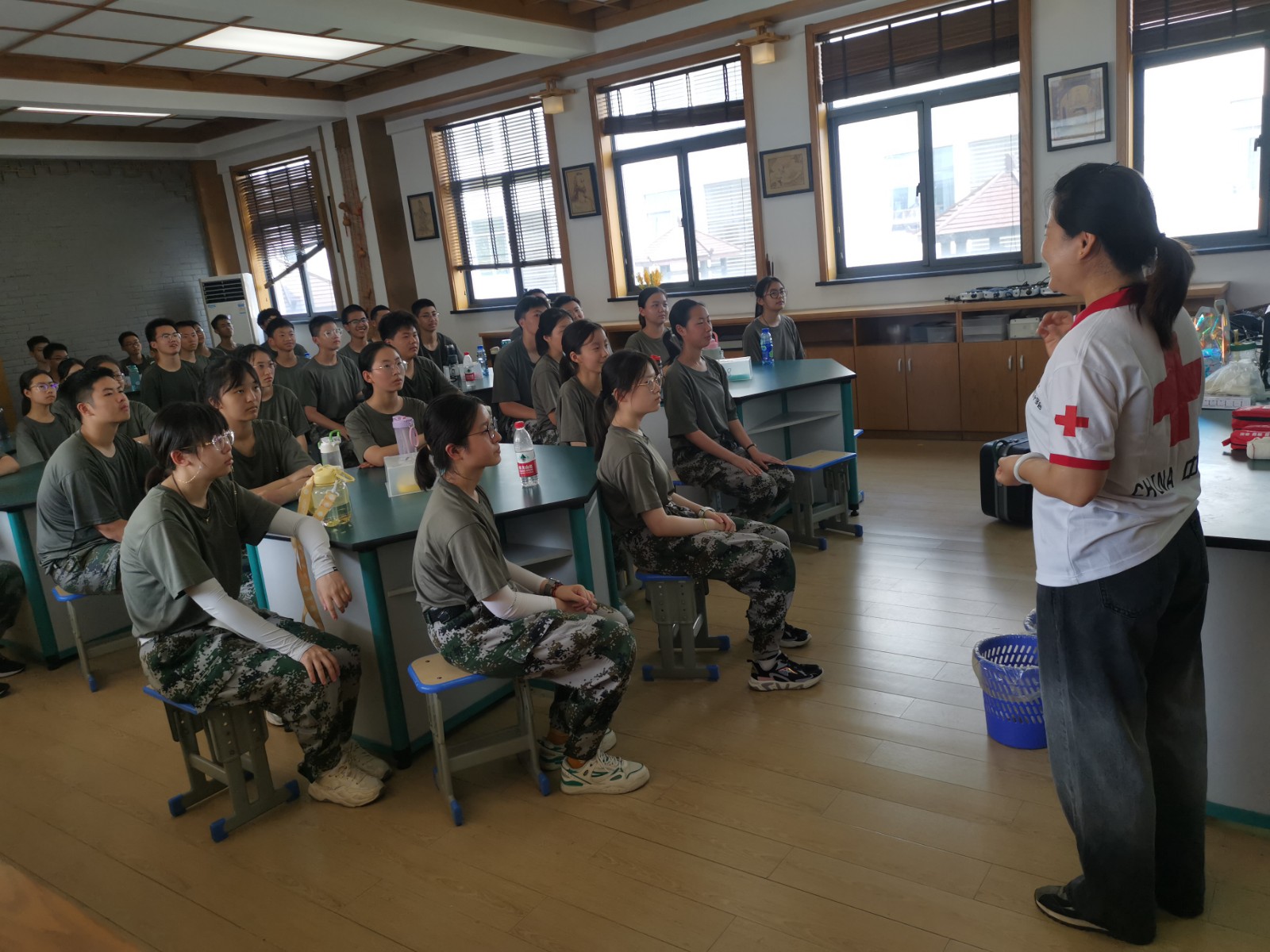 “头顶帽式包扎适用于头顶部皮肤损伤的止血,包扎的口诀为齐眉露耳、枕后交叉、额前打结……”8月11日,江苏省镇江第一中学的高一新生在军训中上了一堂别开生面的应急救护培训课,来自镇江市红十字会的救护师资志愿者走进市青少年综合实践基地,为参加军训的新生进行了红十字急救知识和技能培训,提高他们面对校园突发事件和意外伤害事故的应急救护能力。