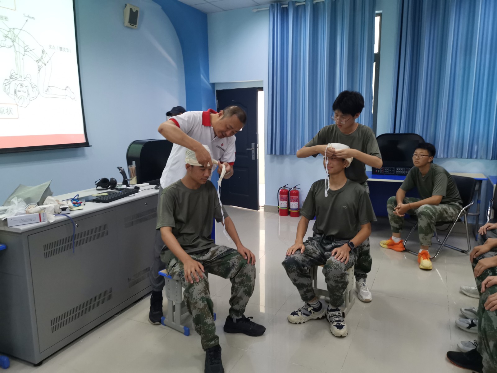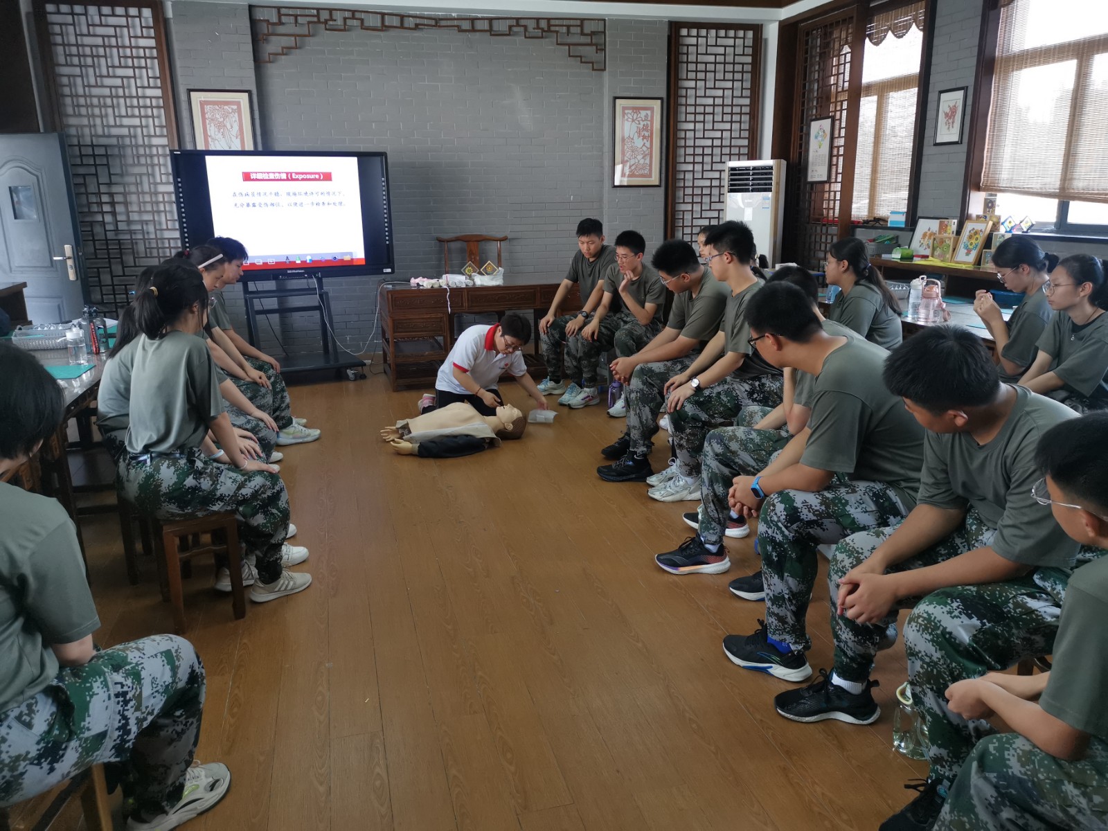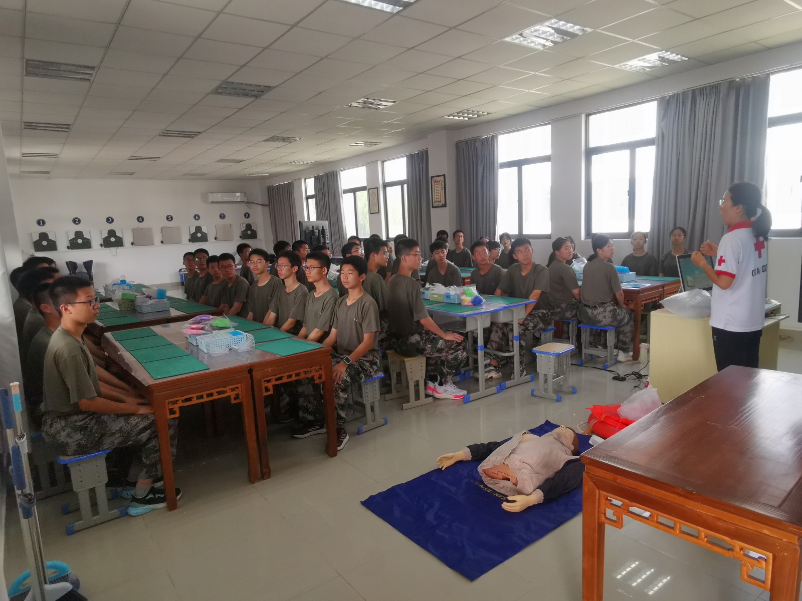 培训活动主要是针对学生学习生活中可能遇到的一些突发事件,如呼吸道异物堵塞、突发性流血包扎、溺水等,科学有效的应对知识和技能。“意识丧失,无颈动脉搏动、无自主呼吸,必须马上进行心肺复苏……”培训老师们通过理论知识讲解和现场操作两种方式,为受训新生讲解了战伤救护基本知识、心肺复苏、AED的使用方法、海姆立克手法、创伤止血包扎及骨折固定等理论知识,并现场示范操作应急救护技能。