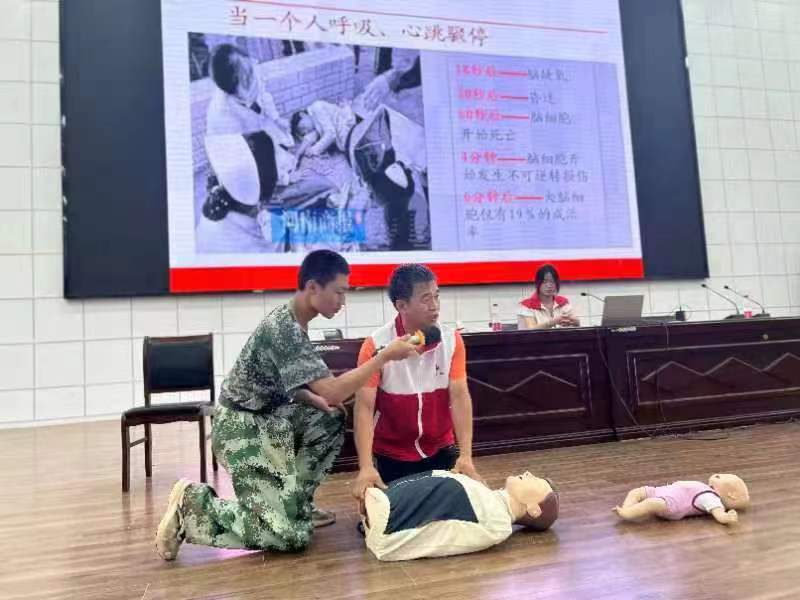 近日,丰县红十字会救护师资来到丰县中学为2023级高一军训新生开展了应急救护知识培训。