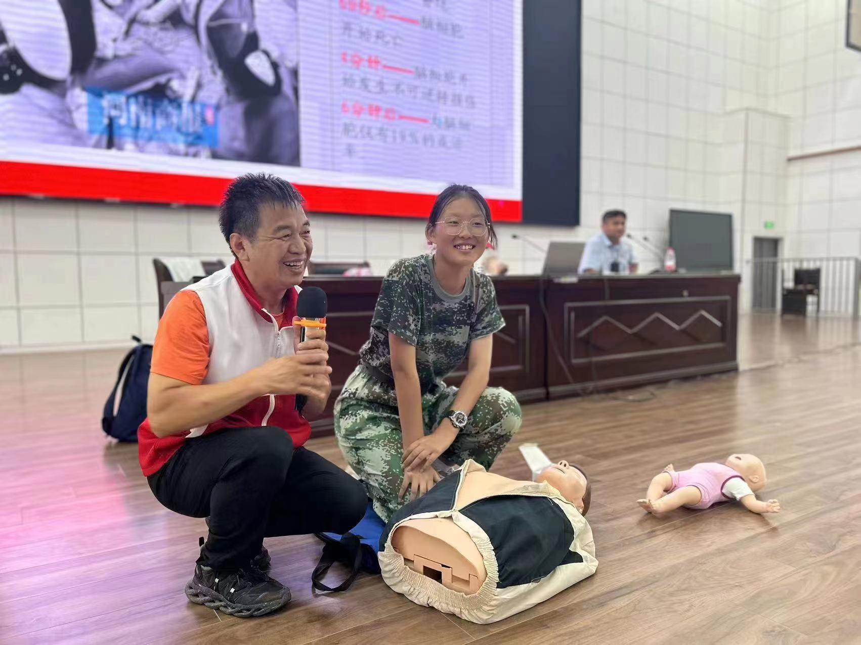 在培训活动中,授课师资结合生活中发生的实例,用通俗易懂的语言,以理论与实践相结合的方式,详细讲解了心脏复苏、气道梗阻及踩踏、溺水、烧烫伤等急救技术,同学们认真学习救护知识,踊跃上台演示,通过亲身体验了解和掌握应急救护的基本方法和操作要领,真正提高学生们在遭遇意外伤害时的自救互救能力。