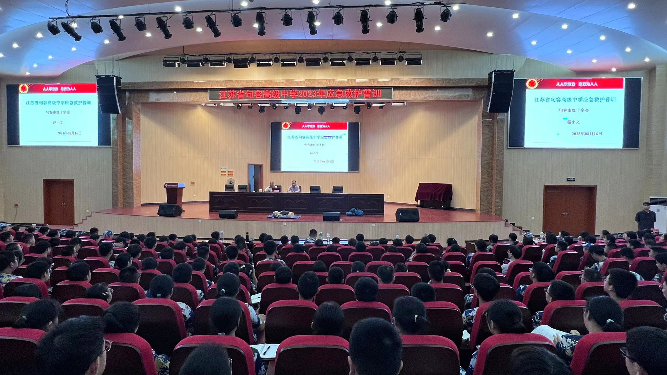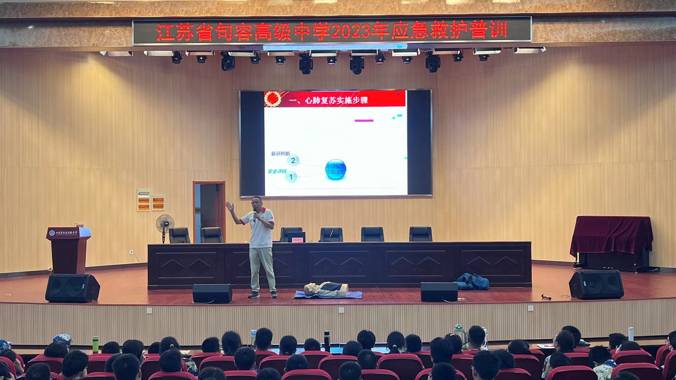 新学期开学在即,高一年级新生军训活动已经展开。为进一步广泛科普宣传急救知识与理念,增强学校师生防护意识、责任意识和自救互救能力,16日,句容市红十字会救护培训讲师赵小文来到江苏省句容高级中学,为600多名正在进行军训的高一年级新生开展应急救护技能培训。
