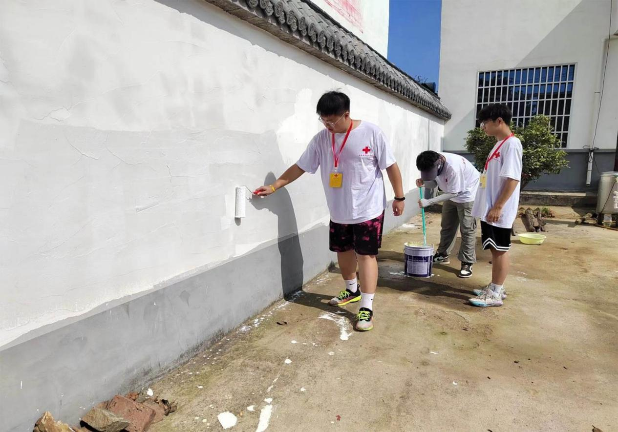 下午志愿者们根据绘制的线稿,进行墙面绘制基本的调色与铺色,在绘画的过程中,不仅要忍受一天当中最炎热的时刻,还要在高温的天气下把颜料调到最合适的状态,志愿者们在这个过程中没有一声抱怨,而是积极地投入到墙绘的绘制当中。志愿者们互相协调,互相帮助,充分展现了“人道、博爱、奉献”的红十字精神。