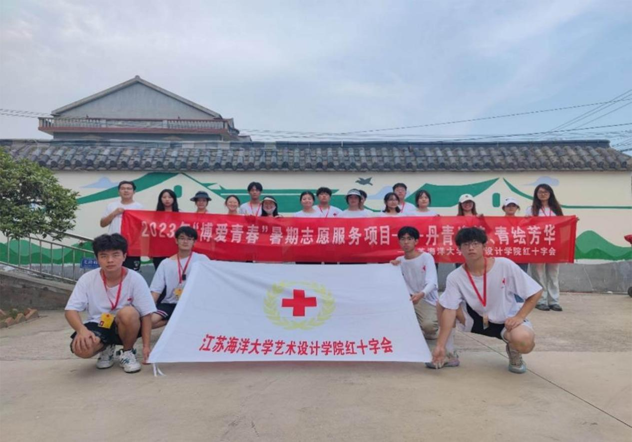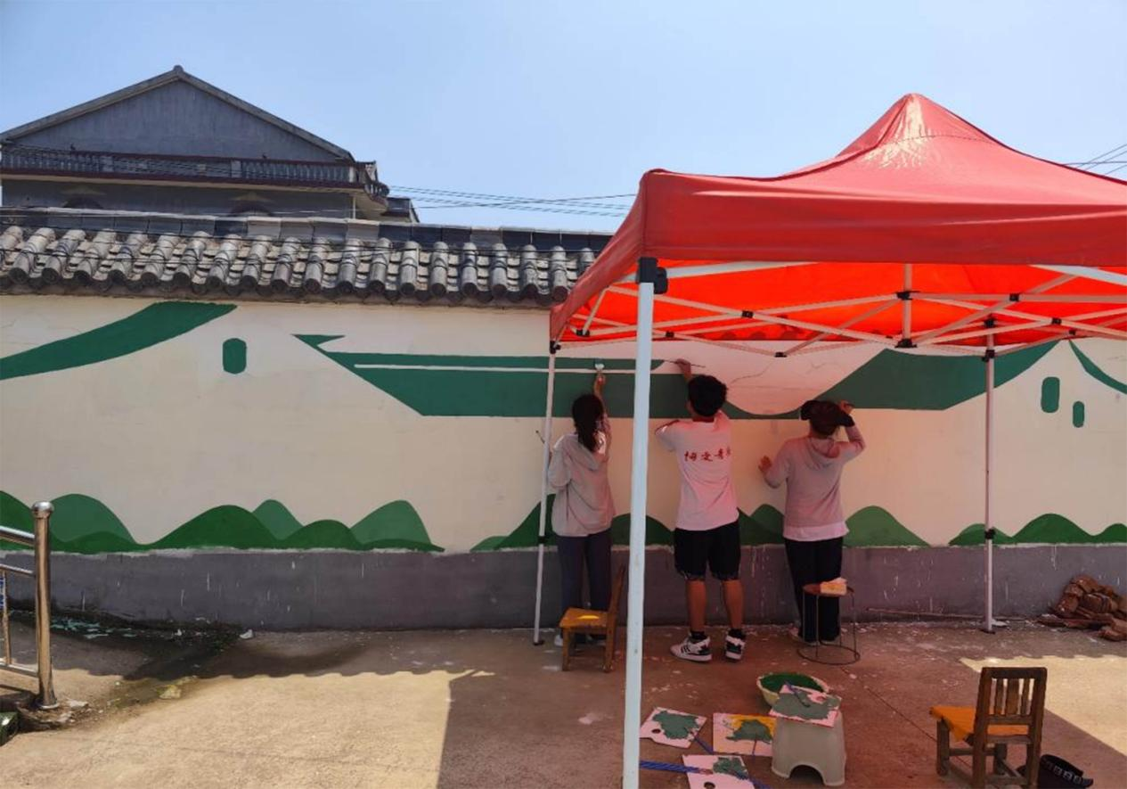 7月9日,江苏海洋大学艺术设计学院红十字会“丹青逸笔,青绘芳华”乡村主题墙绘暑期社会实践团队全体红十字会志愿者开启了第四天的墙绘活动。