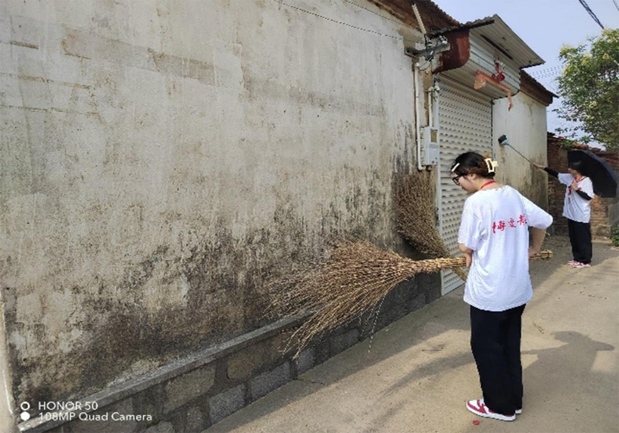 上午,一组绘制出墙面上字体的轮廓,为硕大的墙面增添一份美丽,让新农村计划得以更好地宣传,让我们的墙绘更有意义!二组则是顶着烈日为谢坡村斑驳的墙面清扫污垢,志愿者们将扫去破败,绘出繁荣!