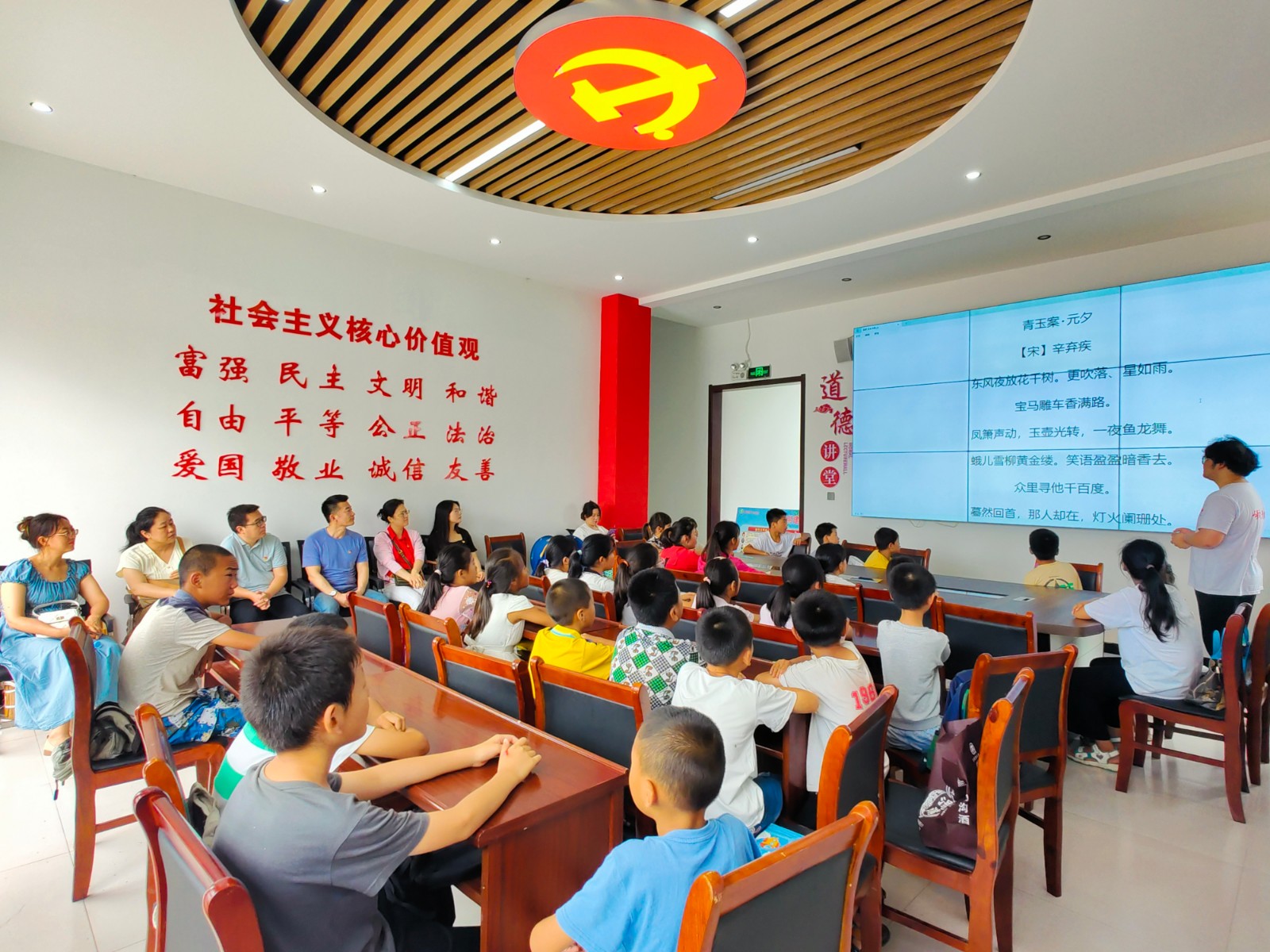 走访慰问中,党员教师听取了暑期志愿服务队员的课堂教学情况。志愿者王慧翔通过诗词内容讲解、诗词朗读范读、诗词仿写创作等方式进行了诗词创作课堂教学,孩子们齐声诵读、踊跃发言,教师们聚精会神、做出点评,志愿者们全心授课、尽心辅导,展现出一堂生动精彩的诗词主题课程。