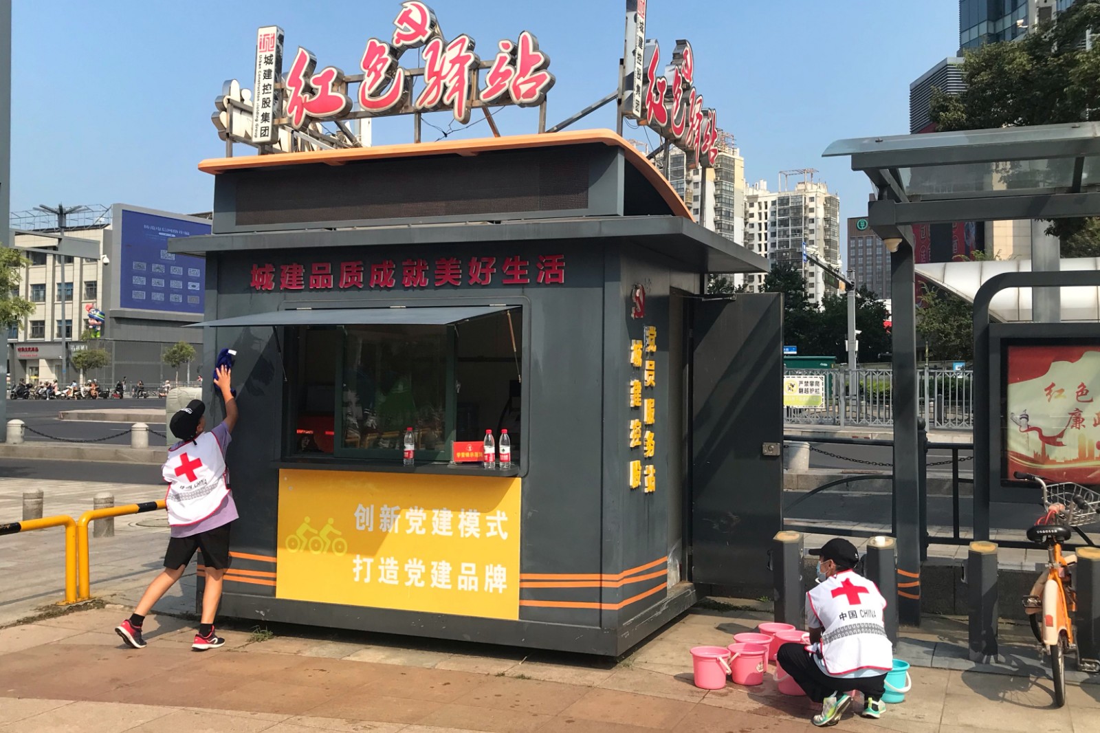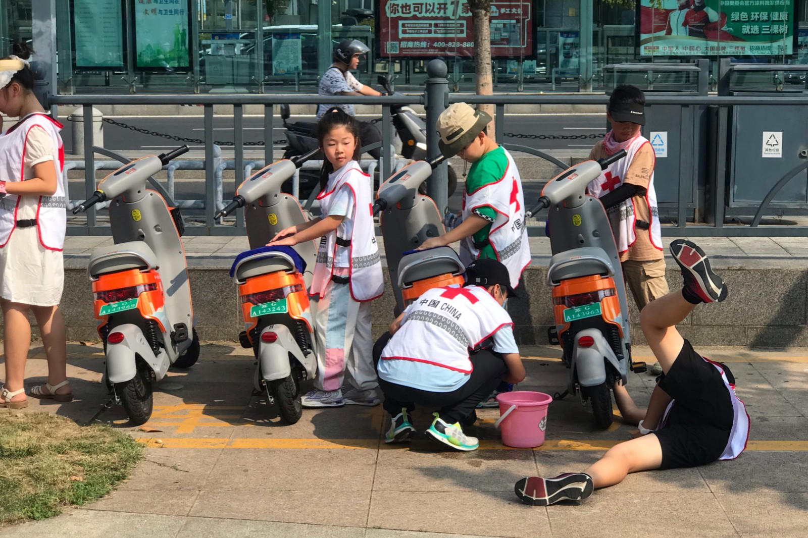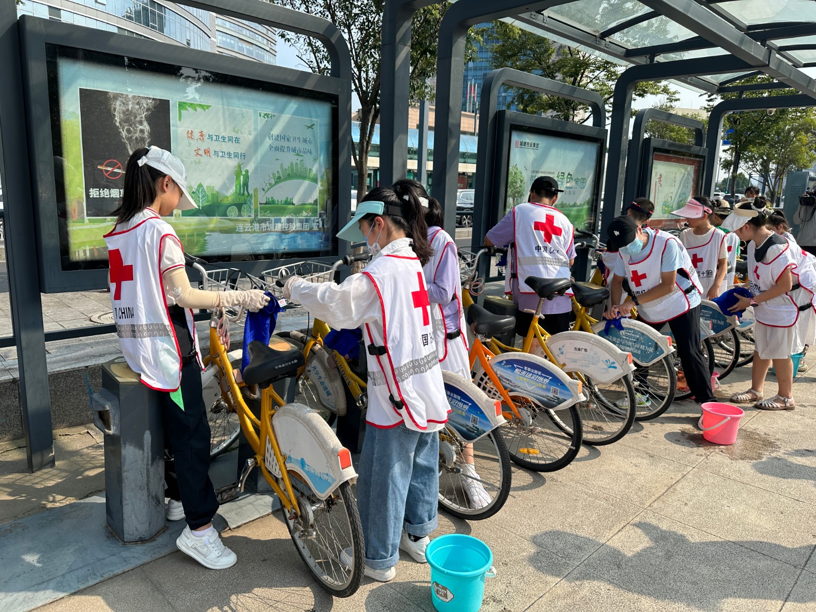 8月17日,连云港市红十字会组织小志愿者在市民广场,开展“擦亮单车倡低碳 文明风尚伴成长”暑假公益志愿服务活动。