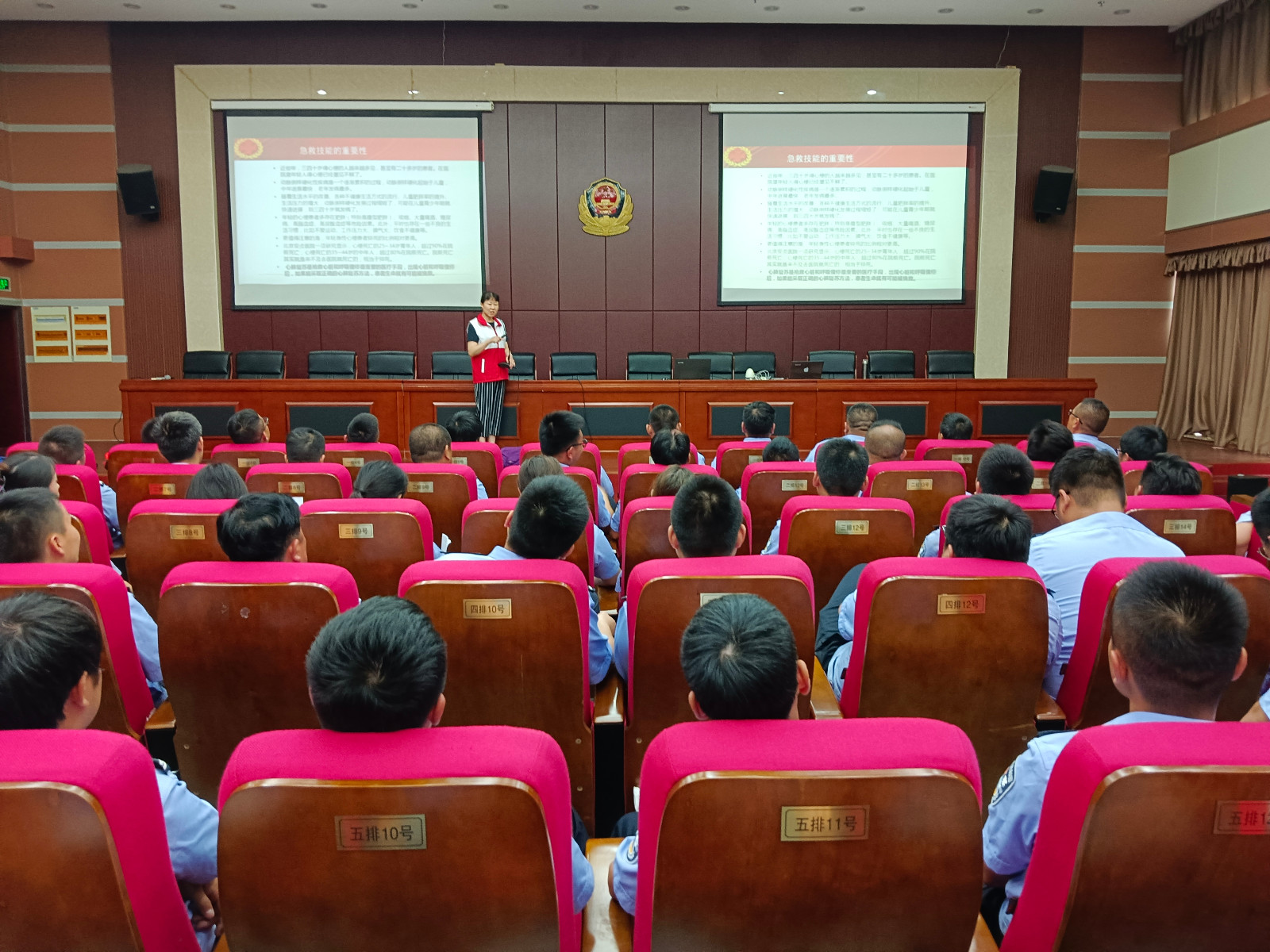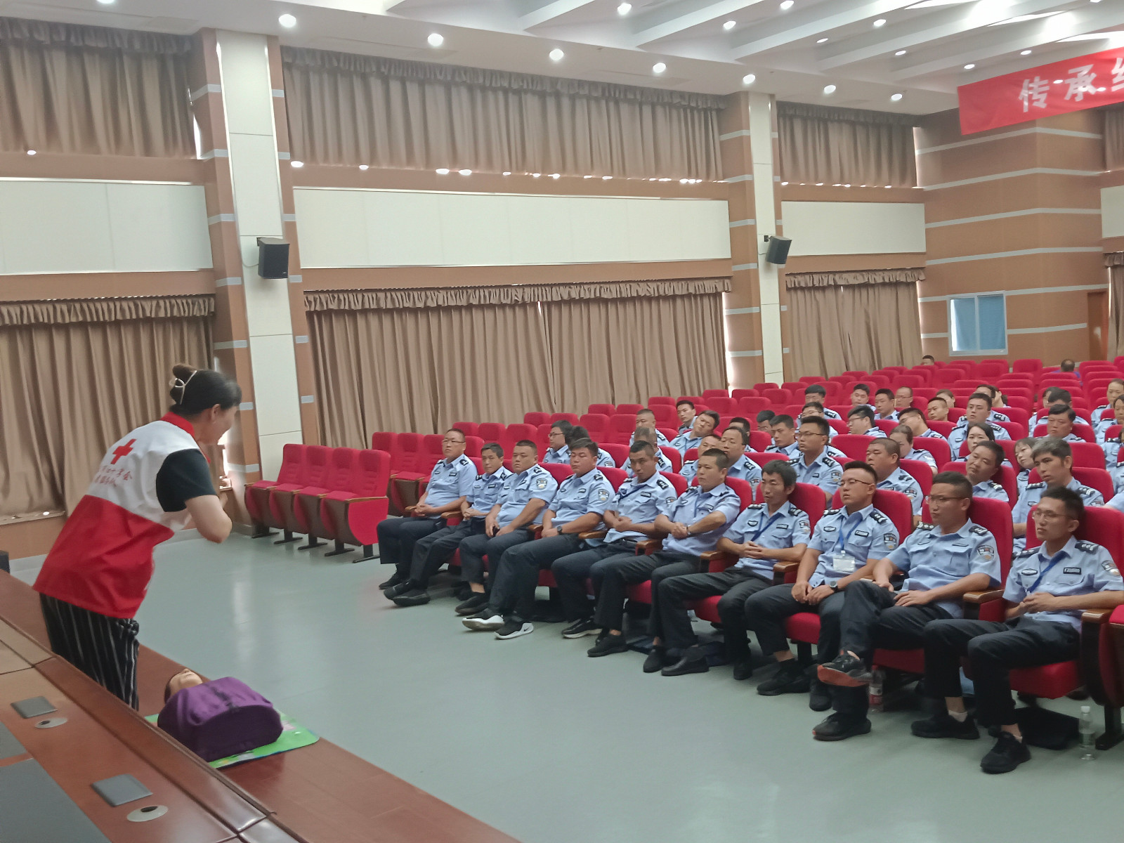 8月17日,在句容市全市公安机关警务辅助人员全员轮训班第14场轮训上,句容市红会讲师朱水清为60名参训人员带来了一堂应急救护普及培训课程。