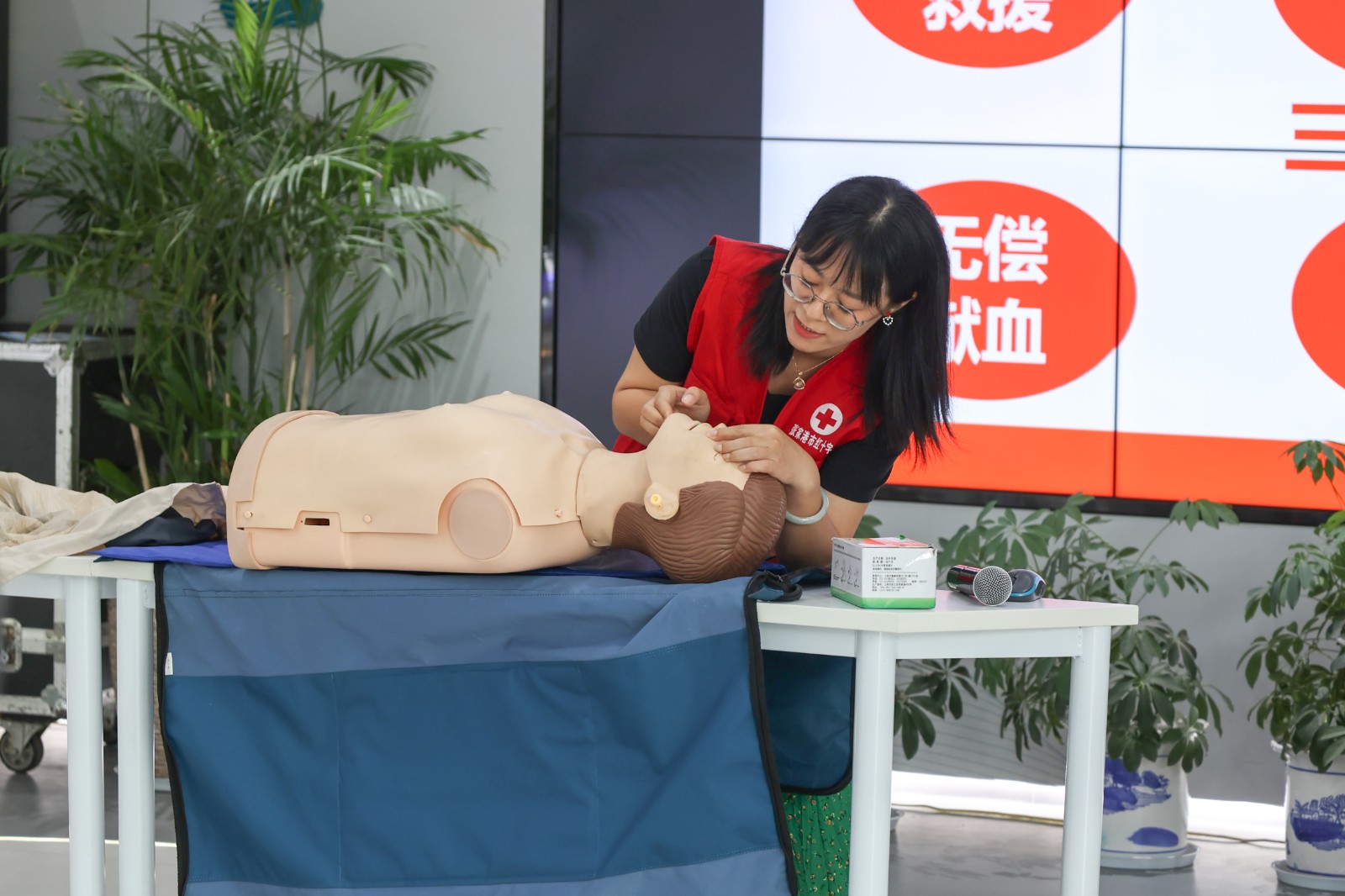 本次培训主要分为理论学习、心肺复苏教学、现场实践三部分进行。红十字救护培训师以图文并茂的形式生动展现救护场景、急救知识等内容,对心肺复苏的基本常识和方法进行全面详细讲解,并使用模型为大家示范了胸外按压,清除口腔异物,使用AED除颤等规范操作。