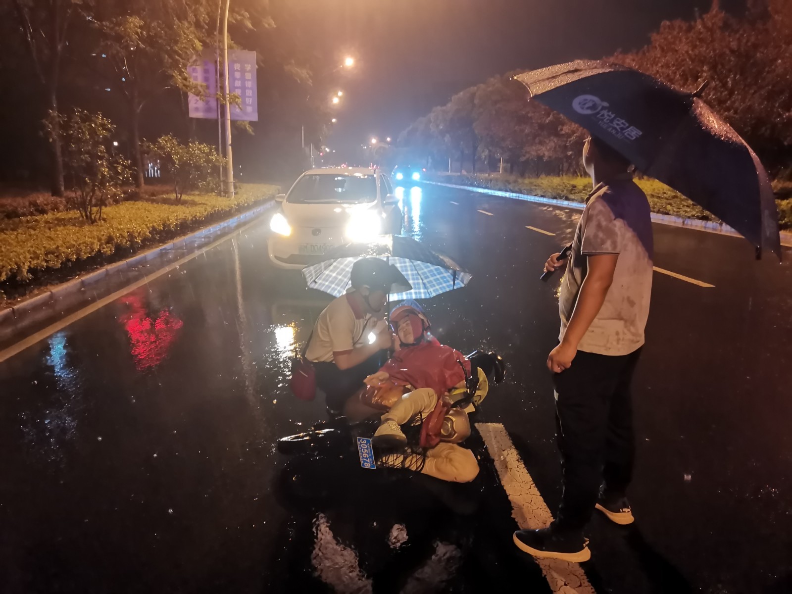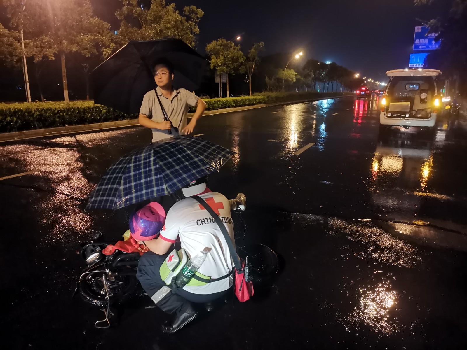 8月13日晚7点多,泰州靖江市红十字救援队队长姚飞和队员朱海军,在雨夜行驶途中遇到车祸受伤者求助,第一时间提供帮助。