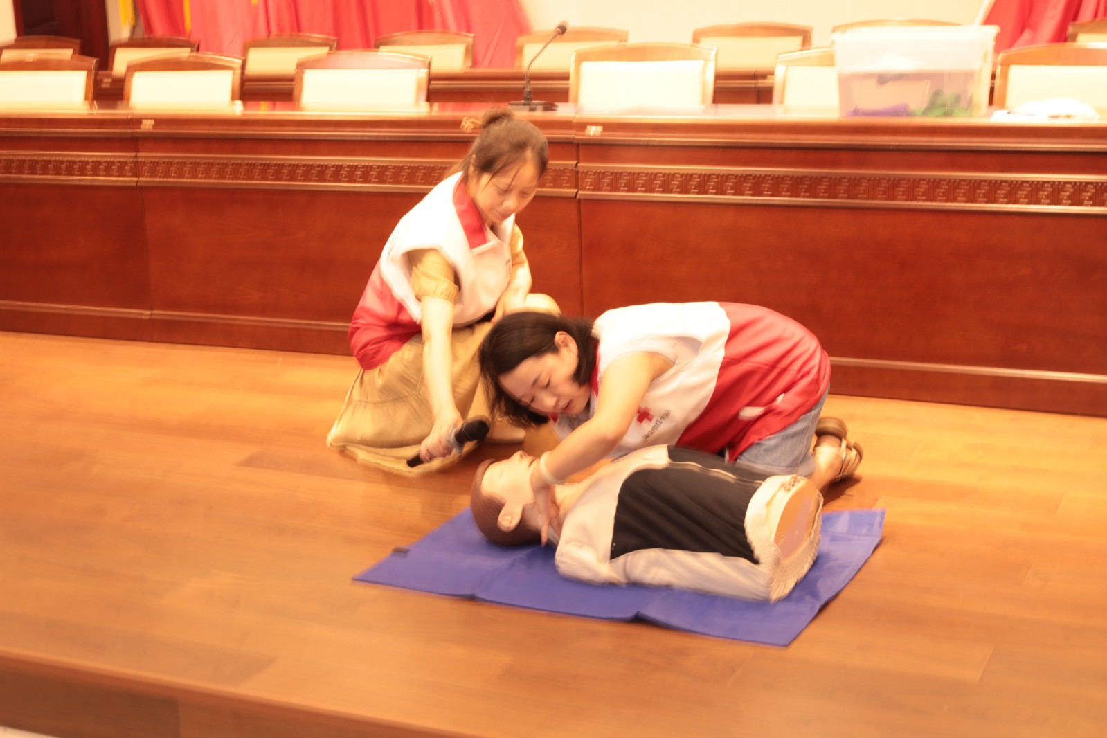 最后,红十字志愿者向现场儿童及家长演示和讲解溺水后心肺复苏技能,并邀请亲子家庭进行演示。