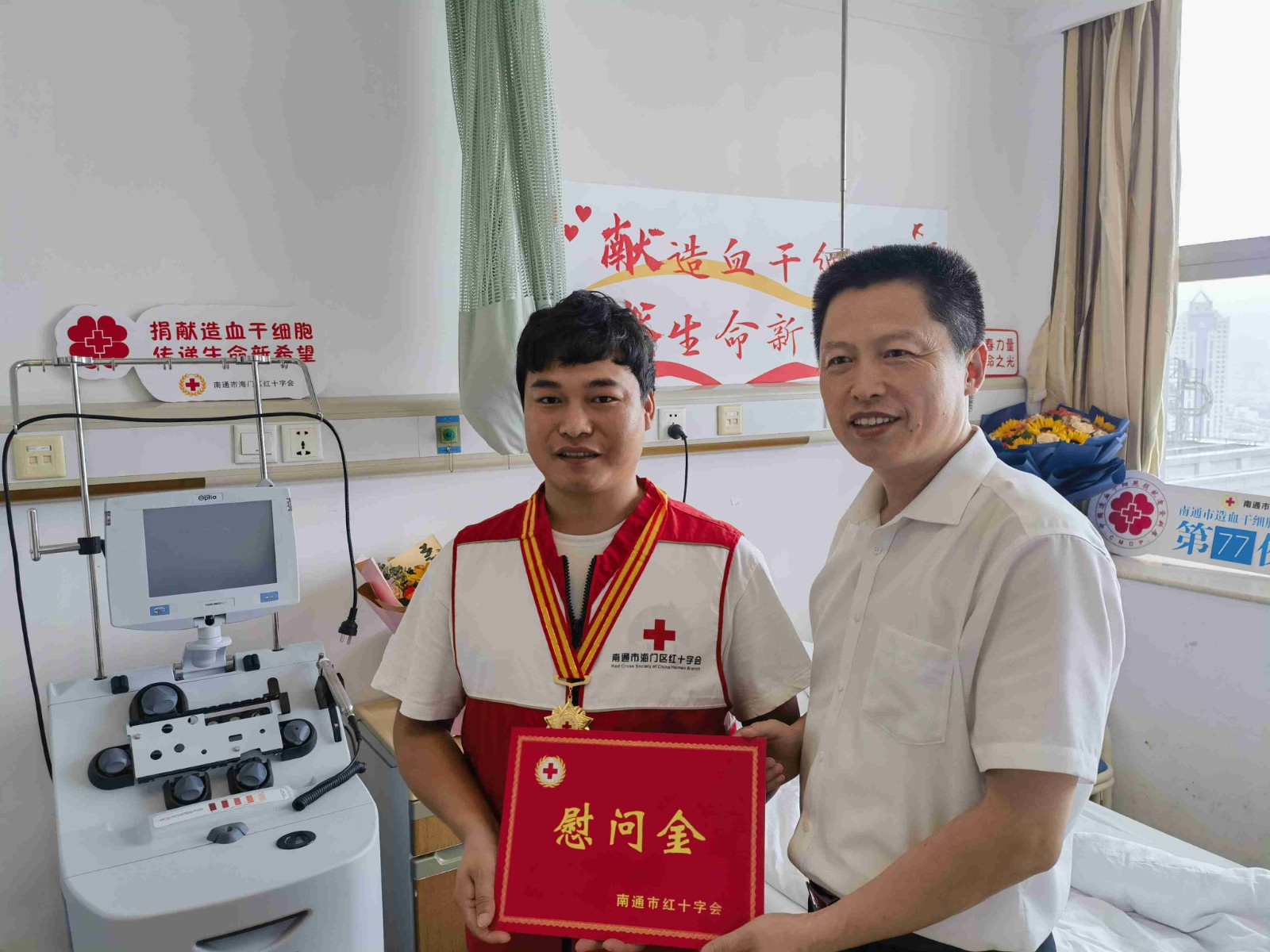 南通市红十字会党组成员、副会长尤春,海门区红十字会党组书记、常务副会长杨曙光来到南通大学附属医院看望李清洋,为他的善举点赞。