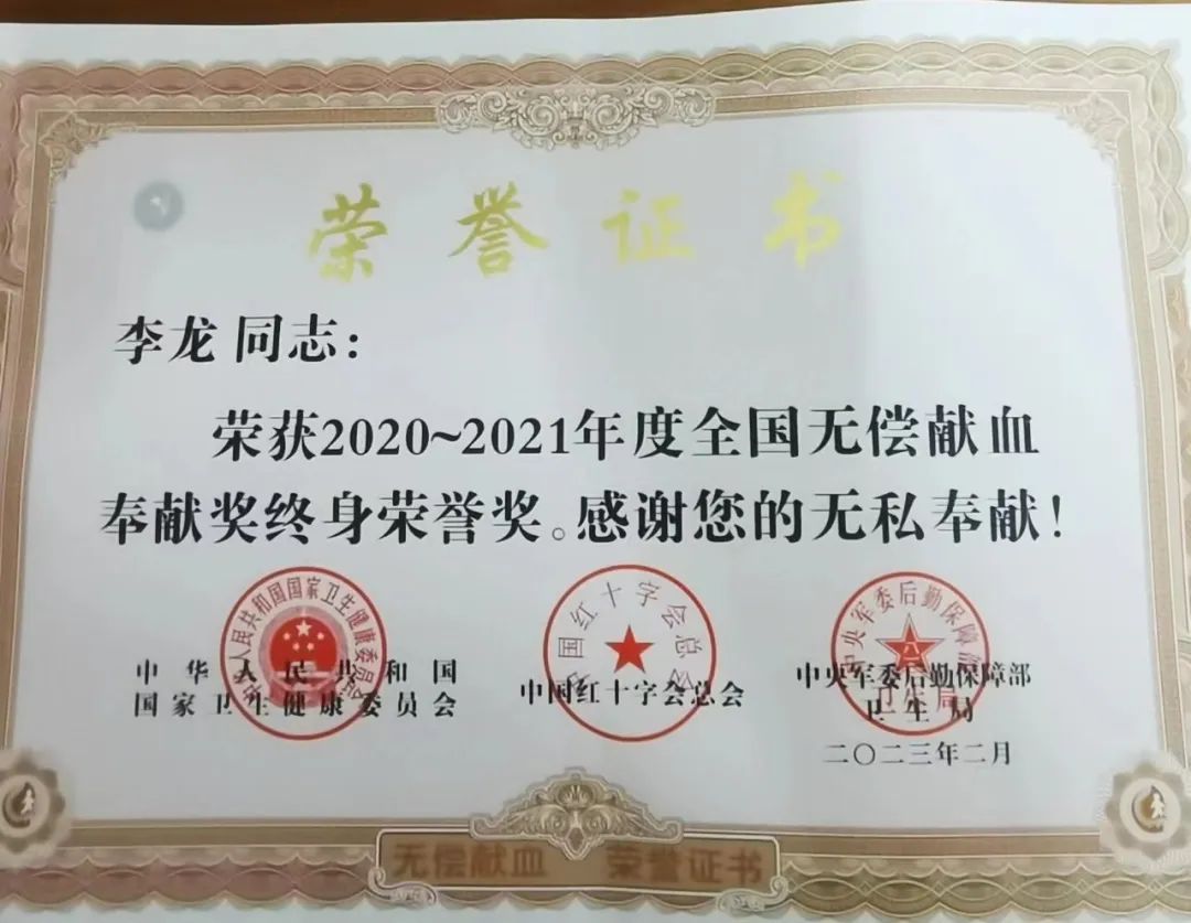 近日,我市红十字救援队员李龙收到国家卫健委、中国红十字总会、中央军委后勤保障部联合授予的“2020-2021年度全国无偿献血奉献奖终身荣誉奖”,这是全国无偿献血最高奖项。