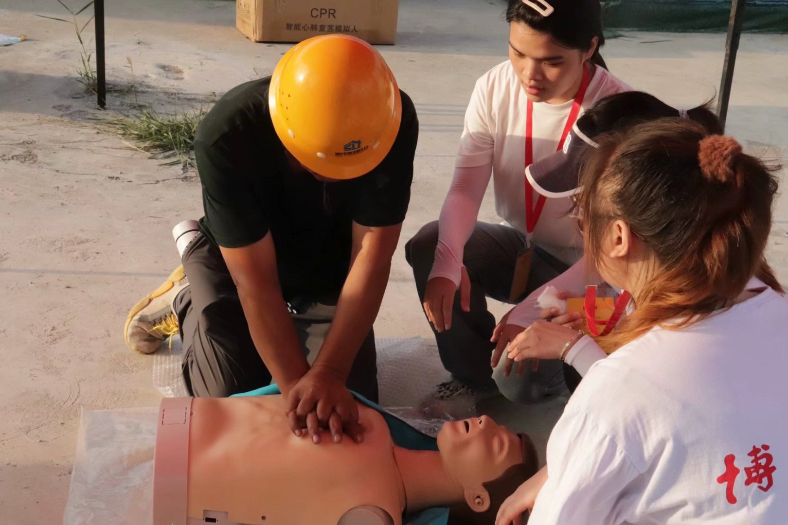 在工地安全员的协助下,志愿者们顺利的布置好了活动场地。宣传组的志愿者们为工人们发放宣传单,教学组的志愿者们则为大家进行止血、包扎和心肺复苏的操作演示,并且鼓励建筑工人们积极参与、动手操作。志愿者耐心的指导参与操作的工人,悉心讲述不同的包扎方法和心肺复苏知识要点,面对工人们提出的疑问也一一进行了解答。其中一位工人向志愿者们说道:“我刚刚听了你们讲的,才知道人工呼吸不是吸气嘞,我一直以为是吸气,这次培训对我们意义重大!”