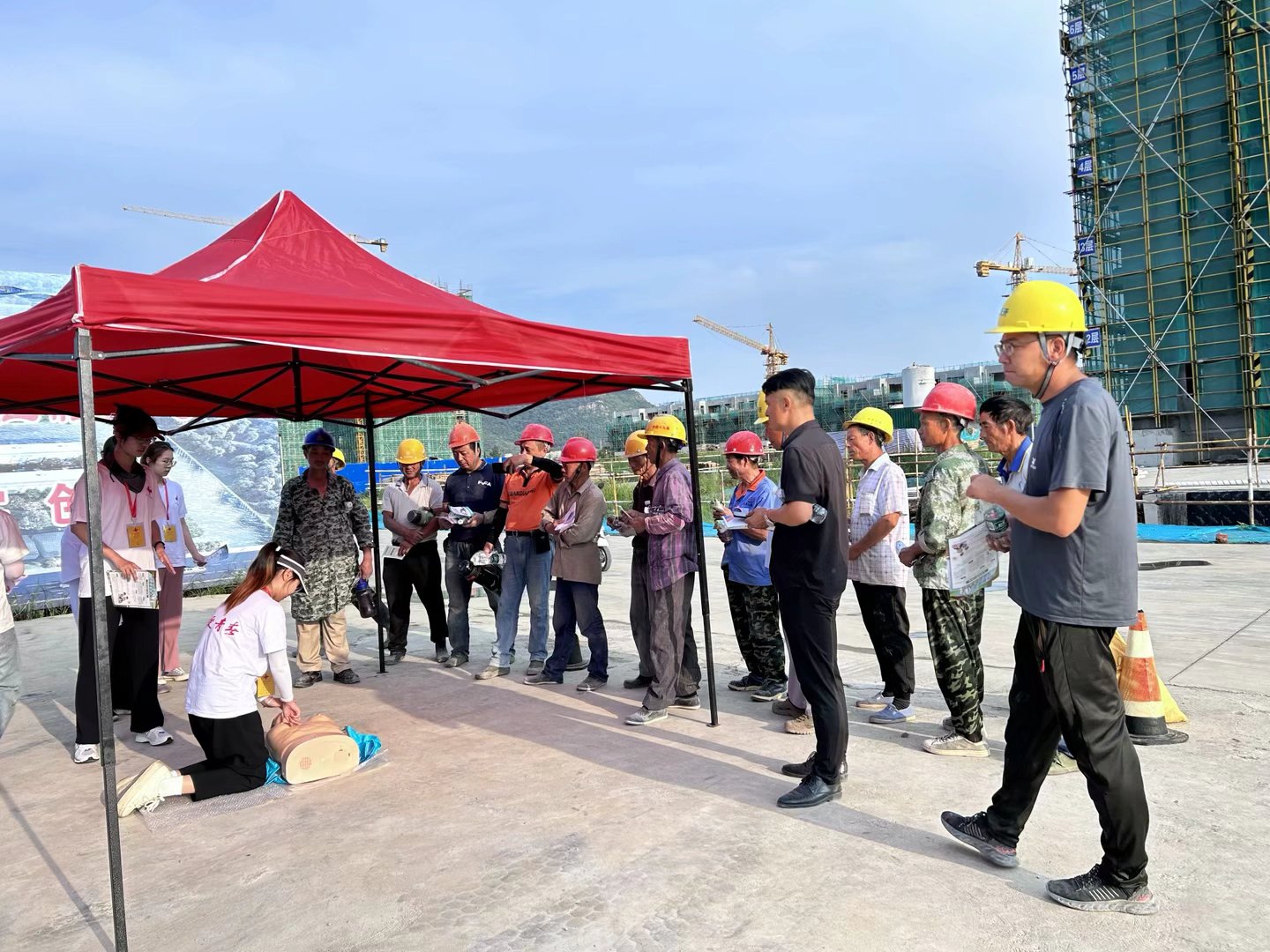 在前期的实地调研和培训后,志愿者们于8月10日下午去到了“承建连云港半岛铭筑项目”工地开展志愿服务活动,为下班的建筑工人进行中暑急救、创伤急救、CPR(心肺复苏)和工伤鉴定方面的培训。
