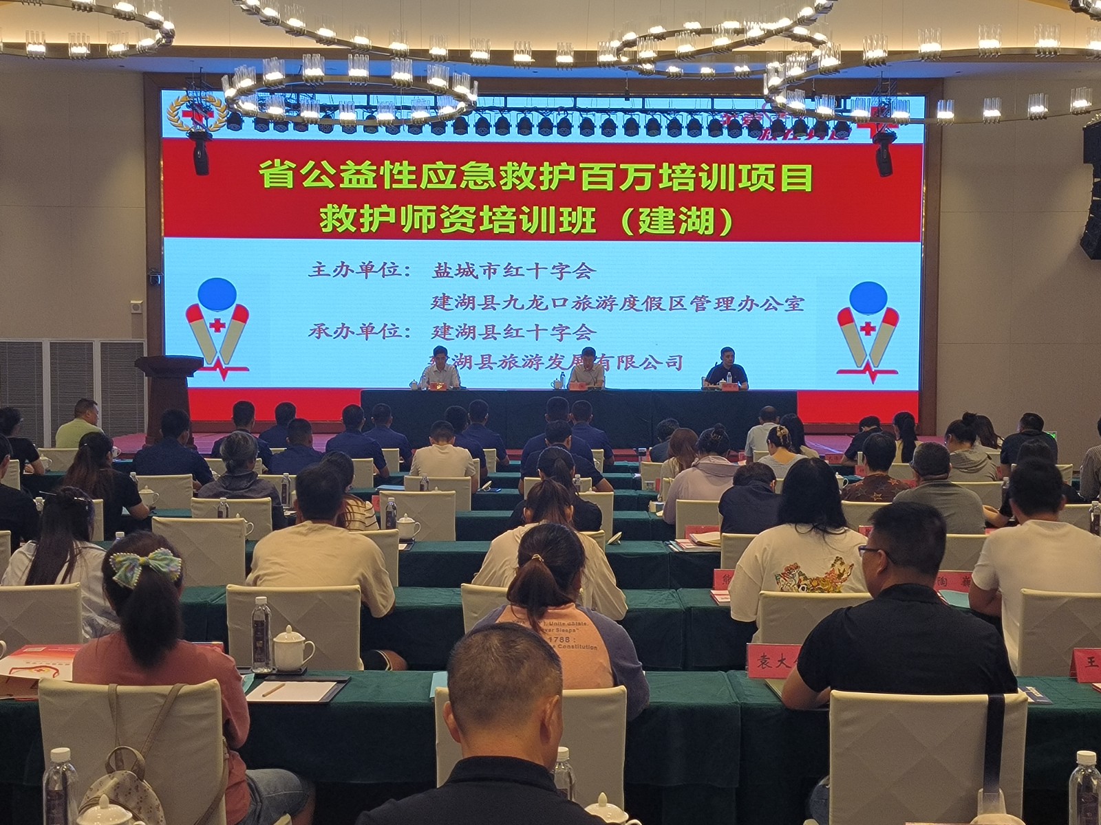为贯彻落实江苏省红十字会《关于推进全省公益性应急救护百万培训项目高质量发展的通知》精神,进一步加强全县公益性应急救护培训师资力量,助力健康建湖建设,8月22日上午,2023年省公益性应急救护百万培训项目救护师资(建湖)培训班在九龙口旅游度假区正式开班。
