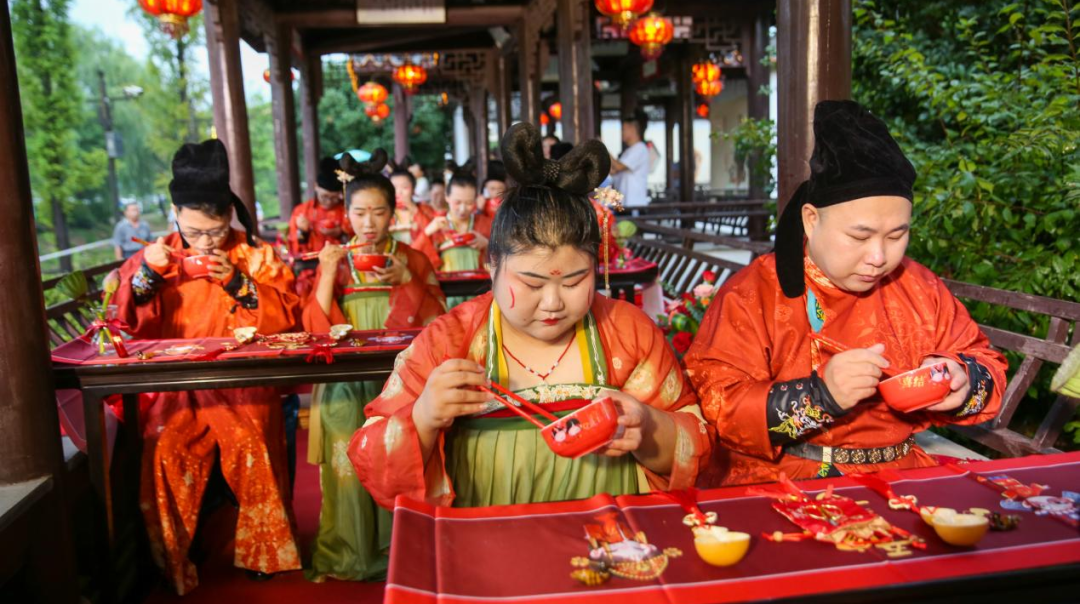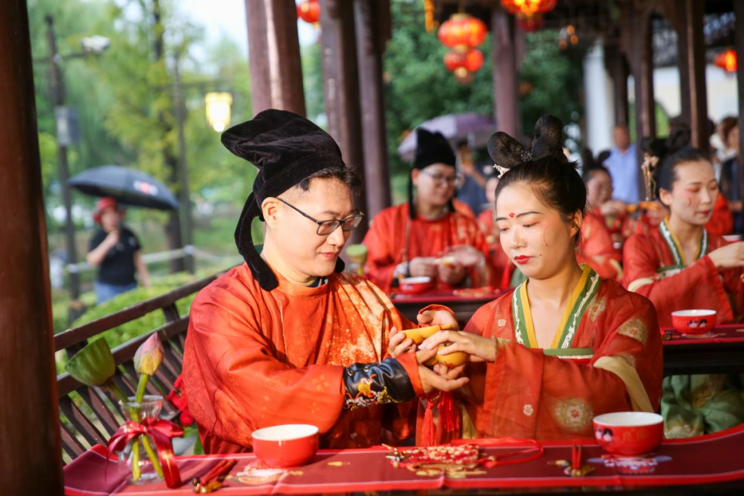 “不知今夕是何夕,催促阳台近镜台。谁道芙蓉水中种,青铜镜里一枝开。”依古礼之仪,新郎到阁前吟诵催妆诗,新娘以团扇遮面出阁。月老为新人们送上了连理红绸,新郎新娘各执红绸一端,一同跨过火盆和马鞍,寓意婚后日子红火又平安。经过同牢礼、合卺礼、结发礼、执手礼的传统仪式后,新人们纷纷许下“爱在七夕执手一生”的爱的承诺。