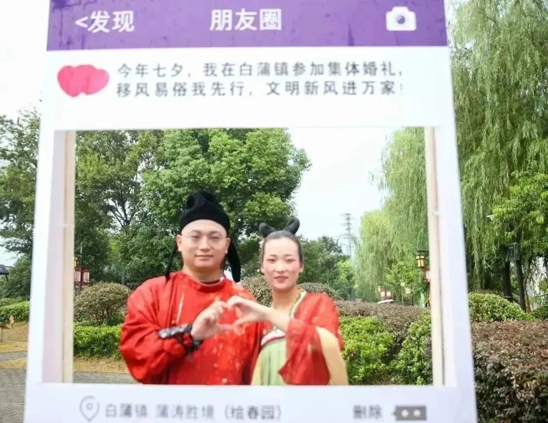8月22日,七夕佳节,由白蒲镇新时代文明实践所、红十字会承办的白蒲镇“爱涌古镇结良缘 文明新风润蒲塘”集体婚礼在绘春园广场浪漫上演。