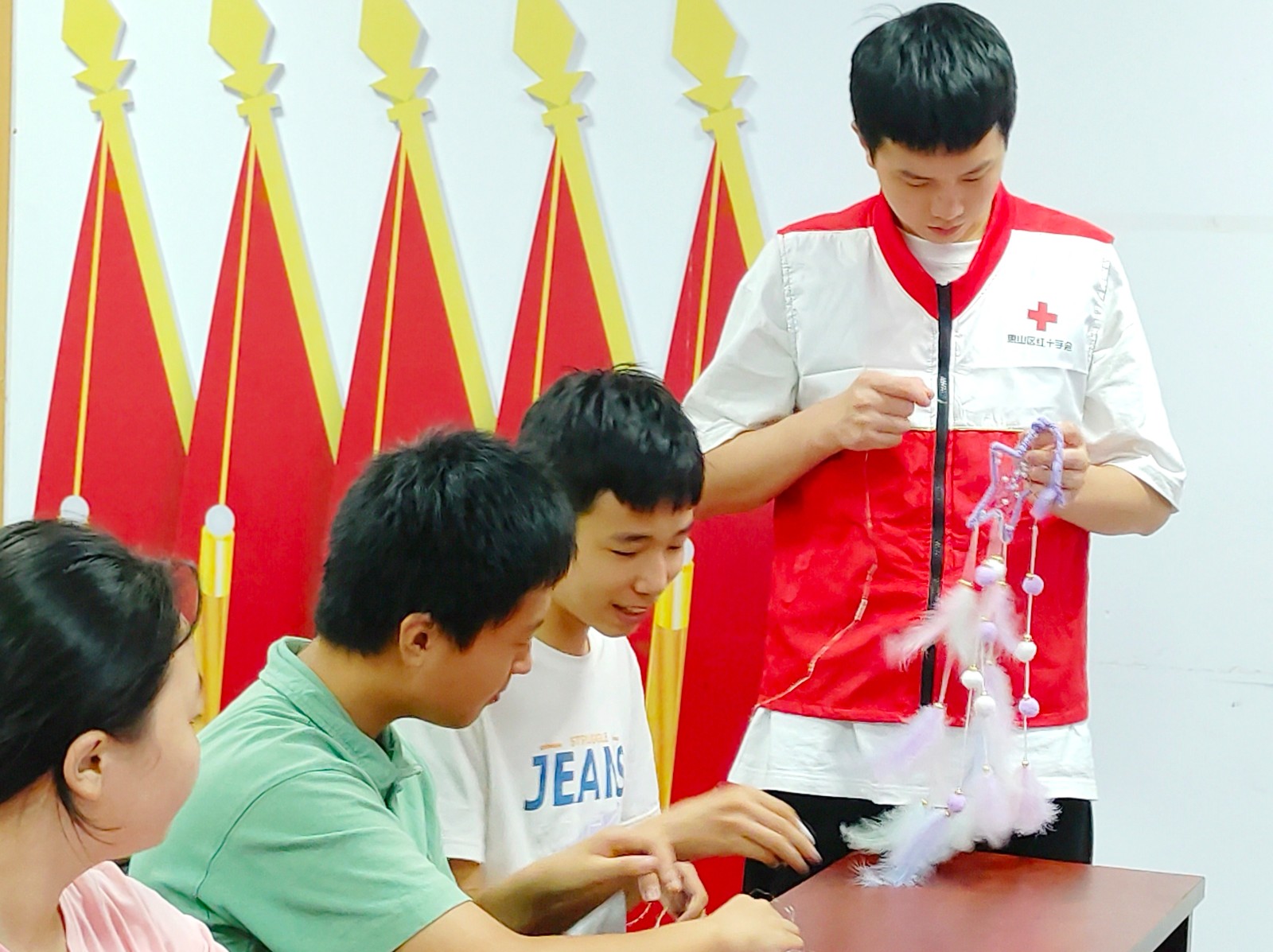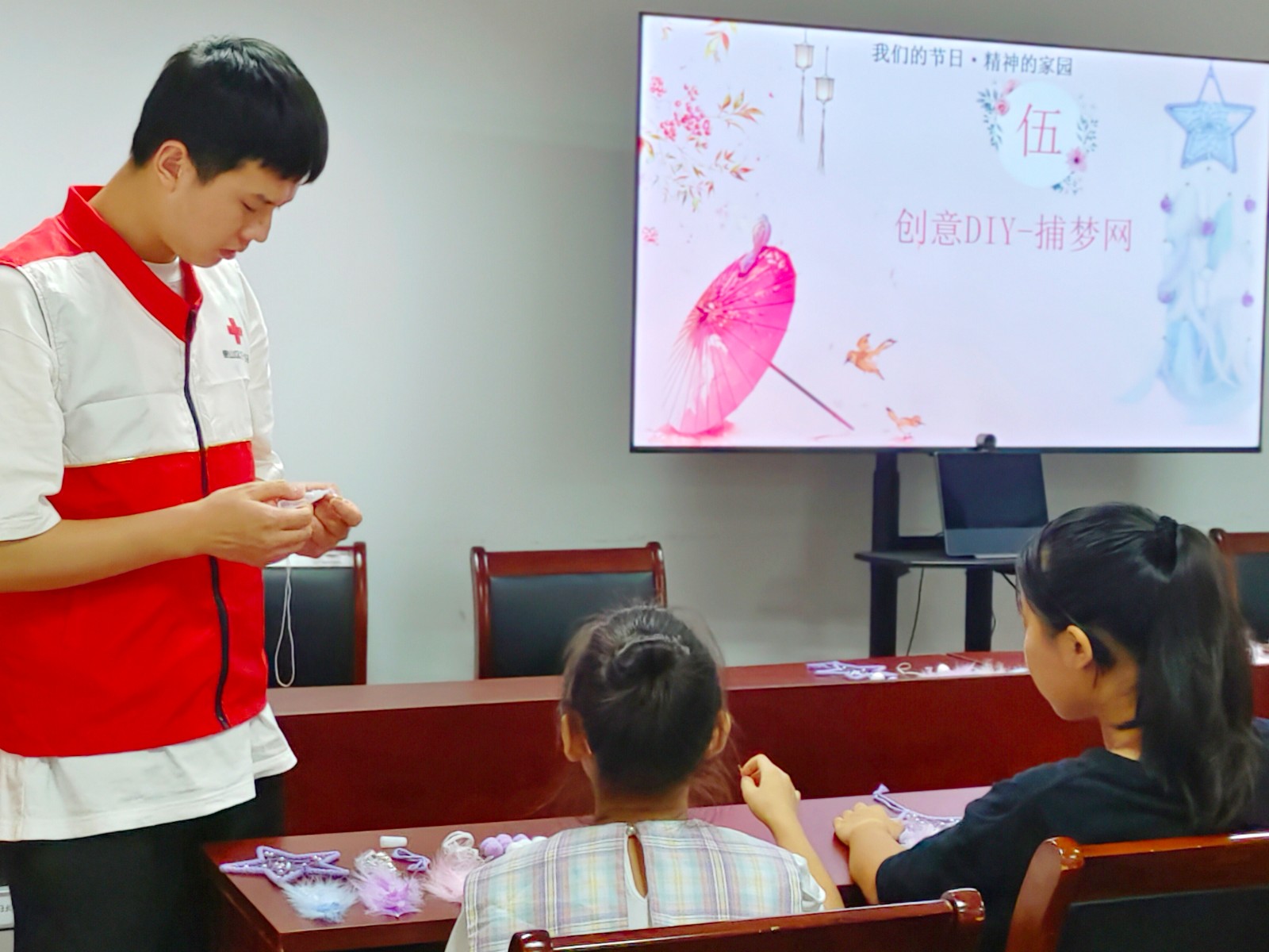 七夕一直有祈愿祝福的传统,而捕梦网同样有驱除噩梦并带来好运之意义。在红会志愿者的指导下,志愿者和孩子们齐心协力相互配合为铁环绕上梦幻的丝线和彩带,并装点上羽毛云朵等装饰。现场一片欢声笑语热闹非凡,大家用好心情做个属于自己的最漂亮的捕梦网。